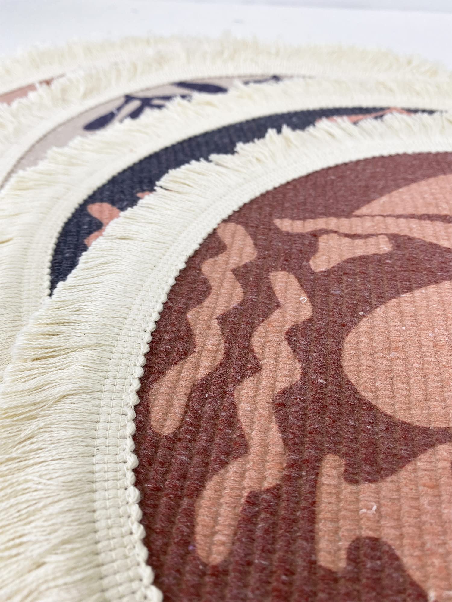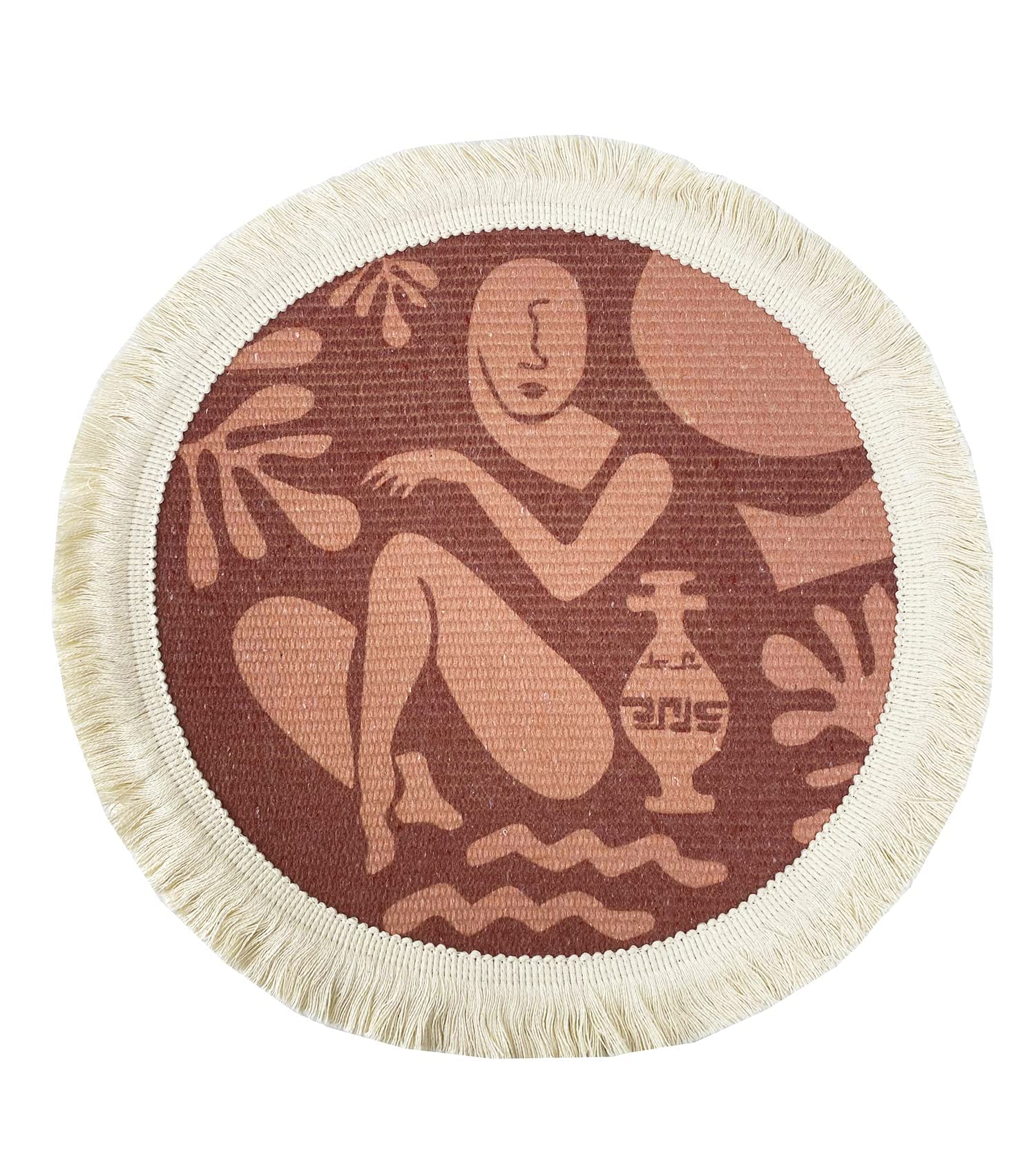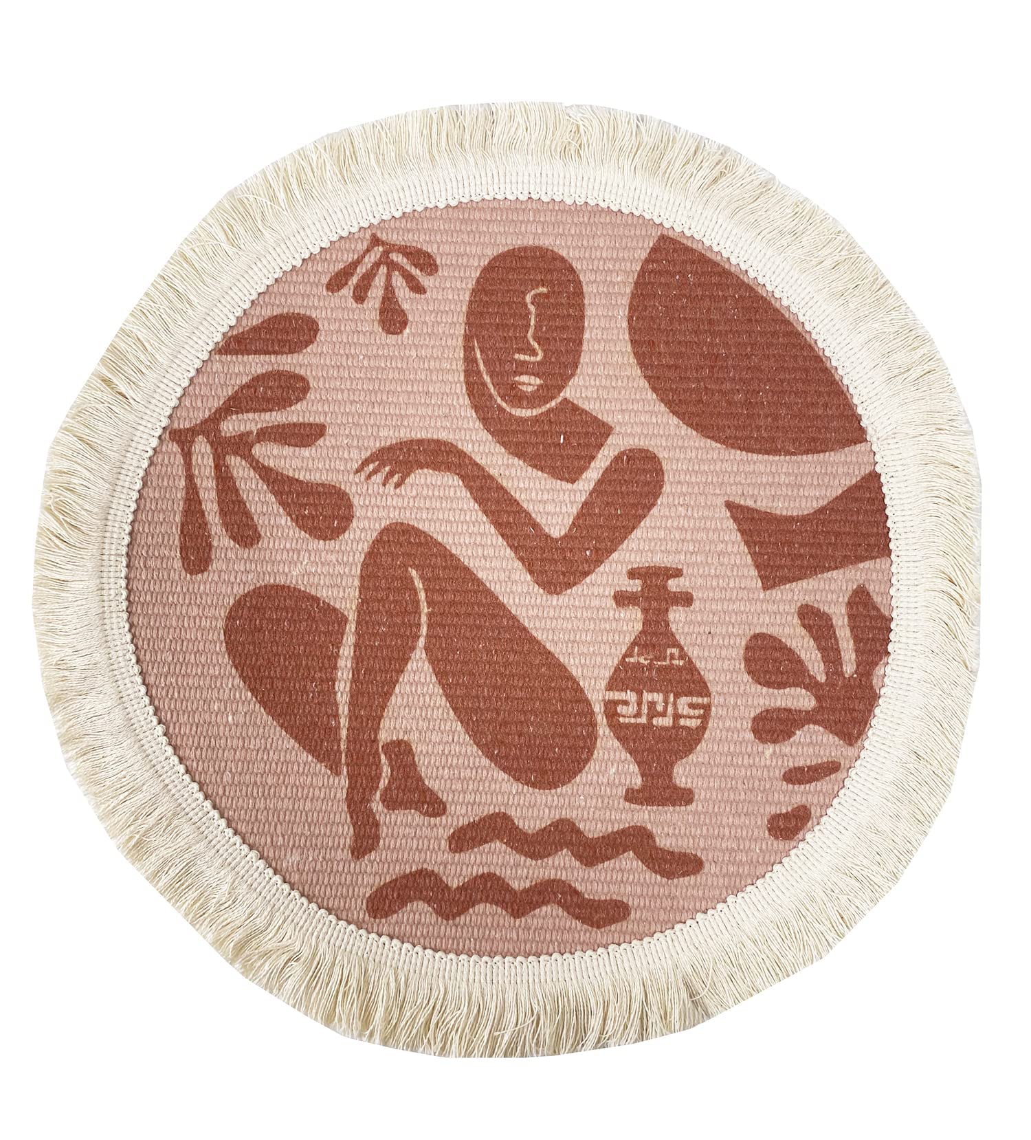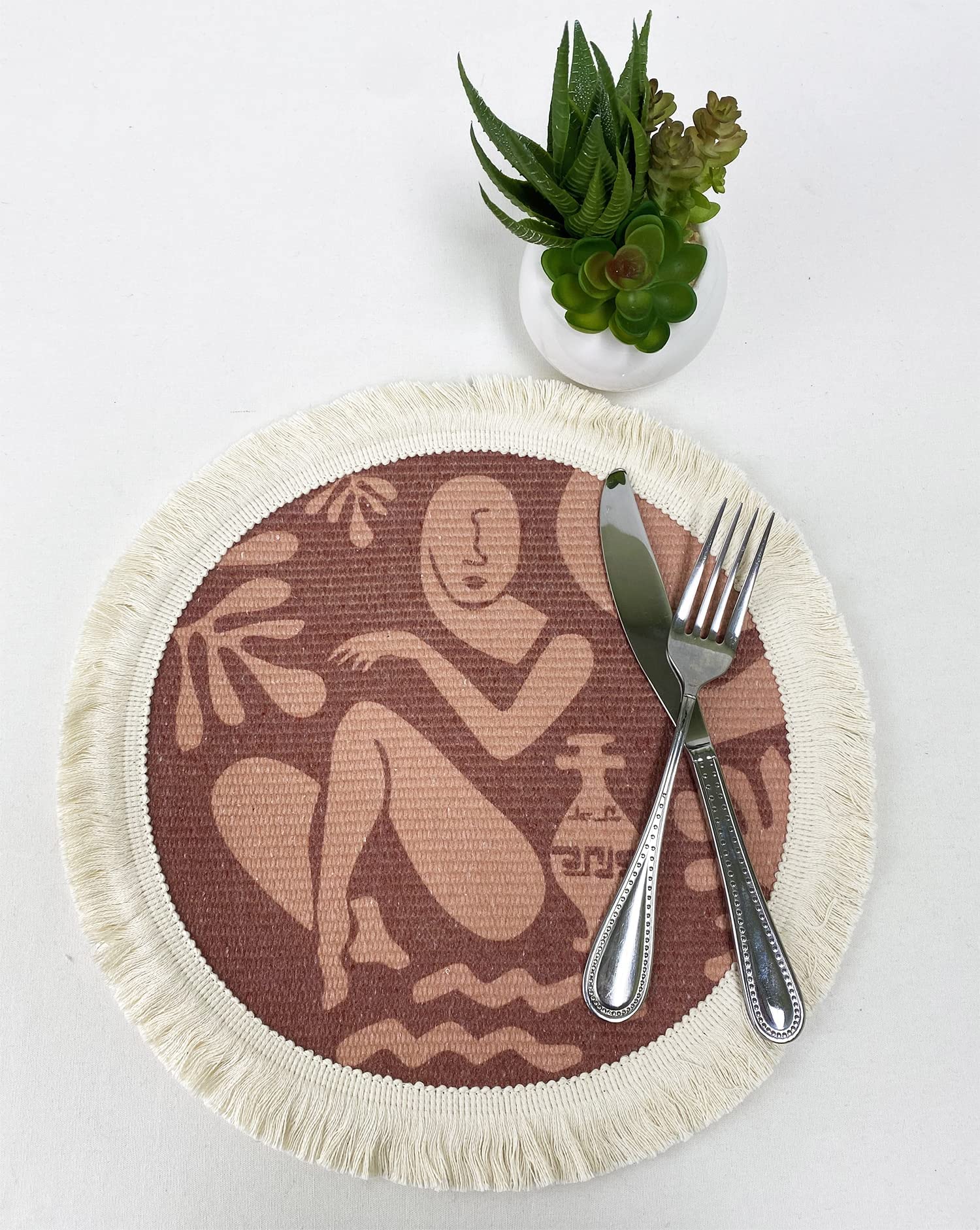 - ABSTRACT FEMALE FRINGE PLACEMATS, SET OF 4 – Add a feminine touch to your home decor with this Abstract Print Fringe Placemat. This cotton blend placemat in a round shape is just as stylish as it is functional. It features a woven design and fringe trim gives a nice textured look, the abstract minimalist print of female make your tabletop style unique and bold. It comes in a soft color for easy coordination with a range of aesthetics, use it for modern boho décor or any surface in the home.