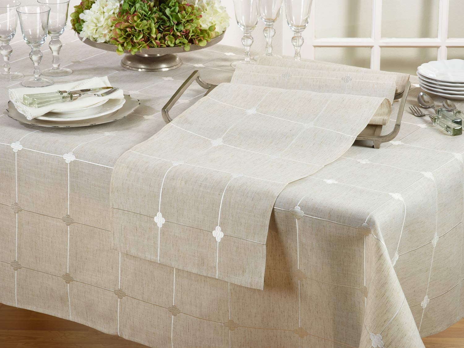 Details: Like a beautiful stained glass pattern, this lovely tablecloth puts you in the same frame of mind. It gives off tranquility and graceful vibes, yet it's a tablecloth. It's quite welcoming and brings elegance to any dinner party. Made from a poly-linen blend, it's oblong-shaped, and it features an embroidered check pattern. Fennco Styles, Your Home Styles of Choice