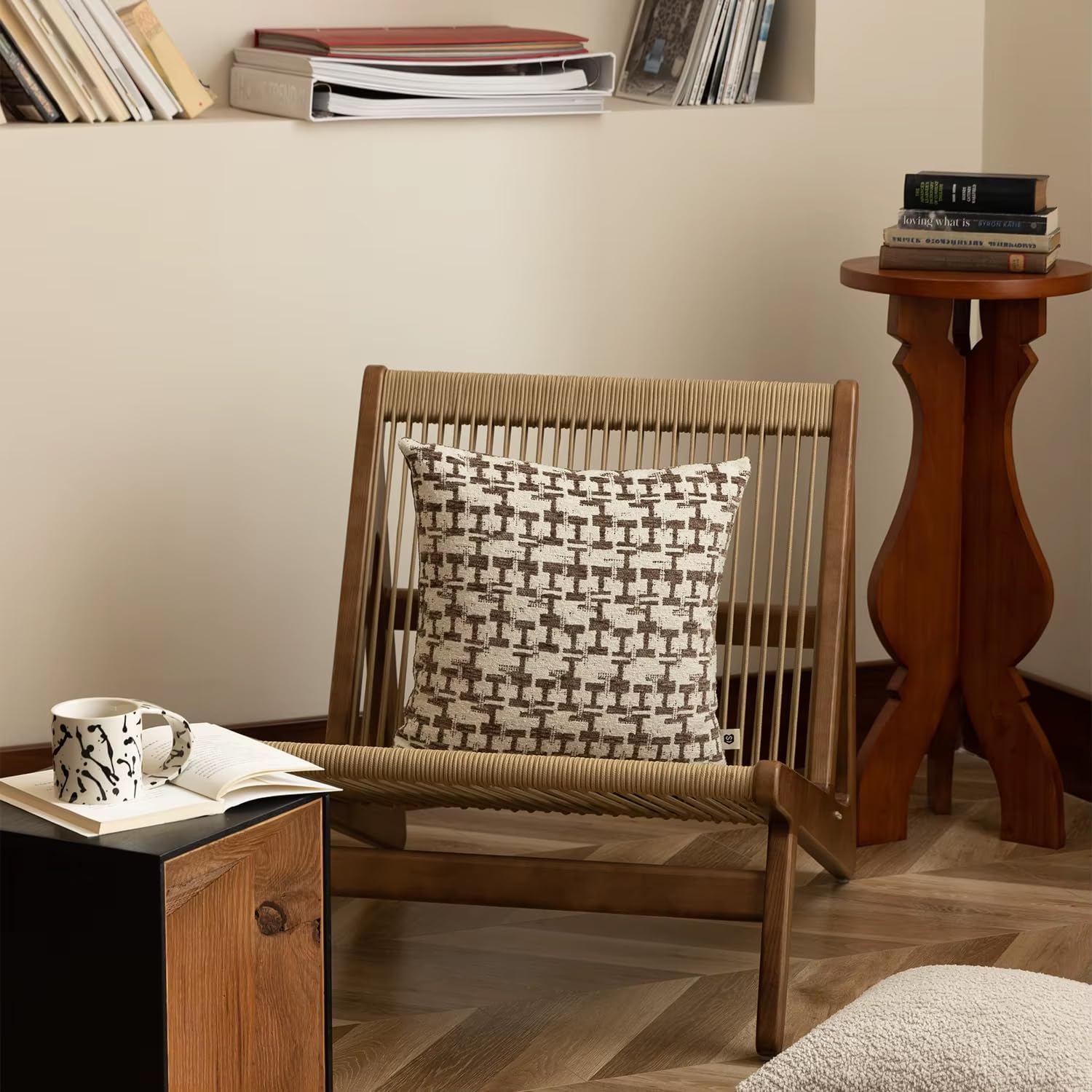 - Chenille Jacquard Geometric Throw Pillow – Add timeless style and cozy texture to your home with this Chenille Jacquard Geometric Throw Pillow. This decorative pillow features a bold, textured pattern in warm brown tones on a soft beige background, blending classic design with contemporary appeal. The plush chenille fabric offers a luxurious feel, while the intricate jacquard weave gives the surface rich dimension and visual interest.
