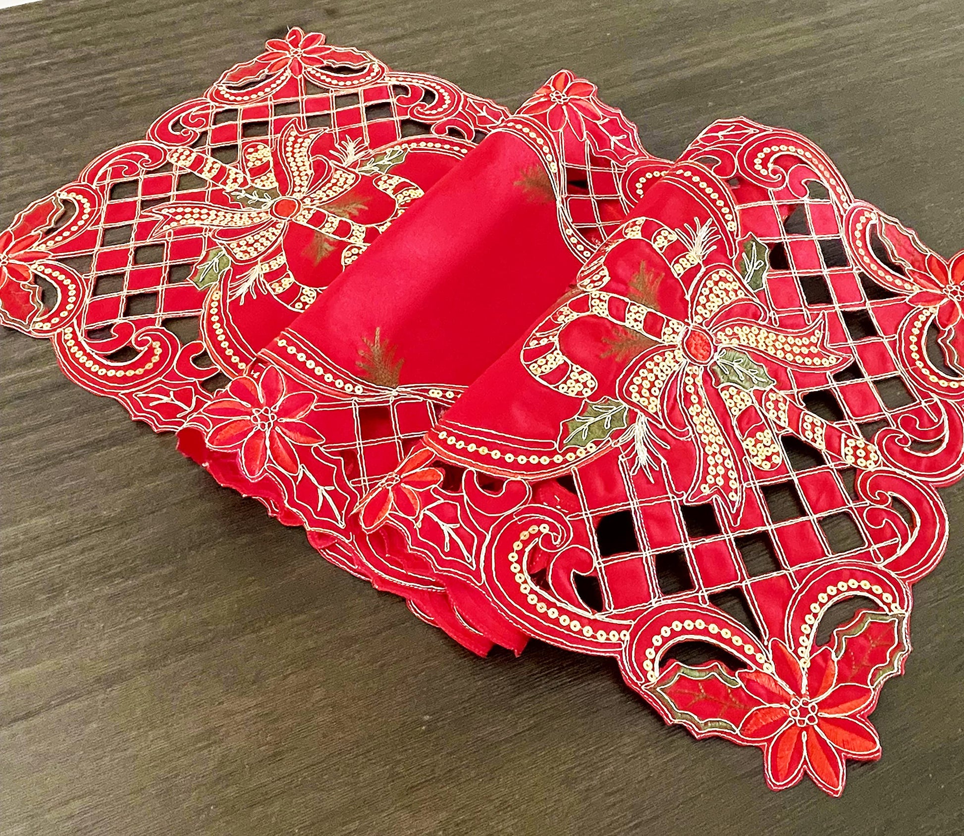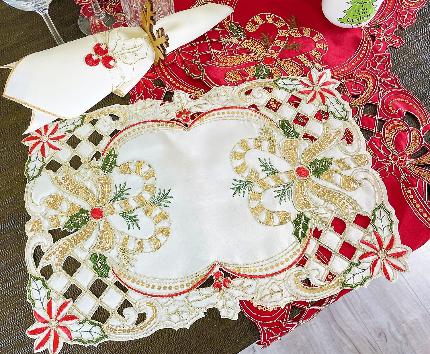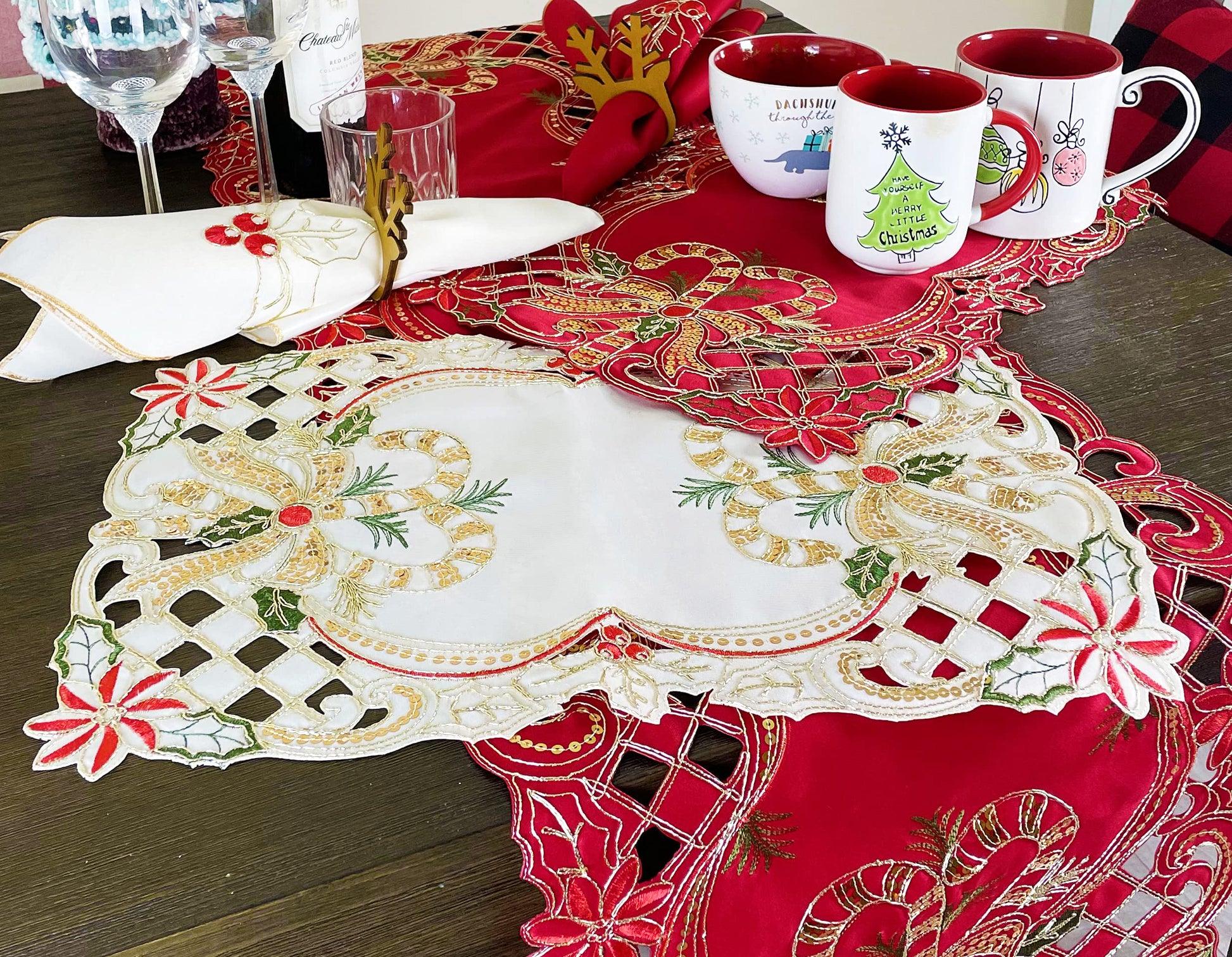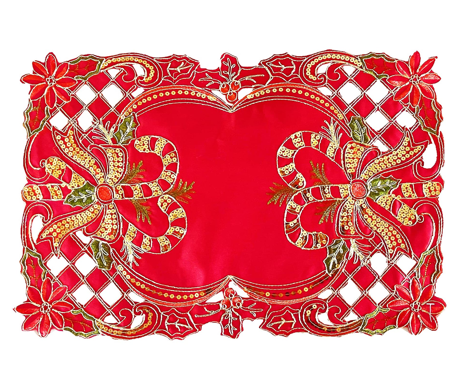 - RED CHRISTMAS EMBROIDERED & SEQUIN CUTWORK PLACEMATS, SET OF 4 – Bring holiday touch to your dining room with these glam Holiday Embroidered Cutwork Placemats! Featuring shimmering sequin and embroidery stitch design in candy cane, ribbon, holly and poinsettia adds a festive look to your table, while beautiful cutwork along the edges for a delicate, Christmas charm effect. It's perfect for any table and coordinating with a matching table runner to create a cohesive look.