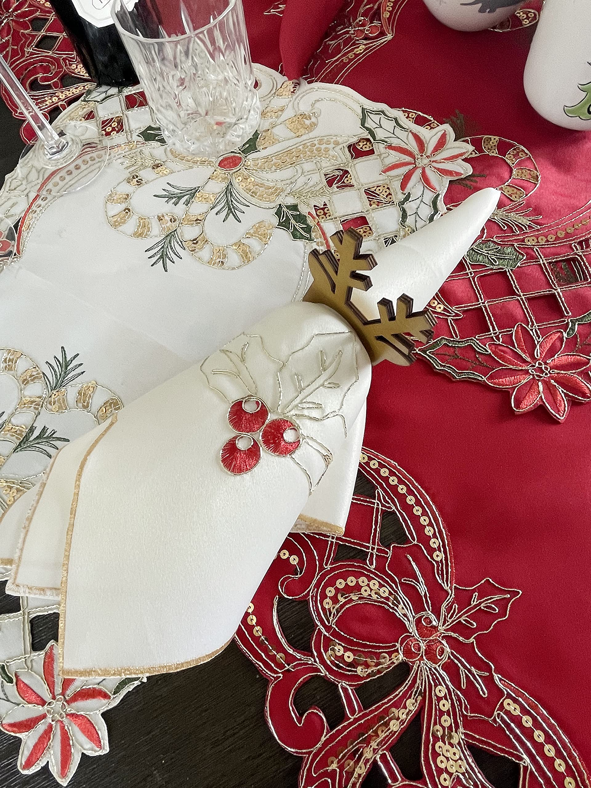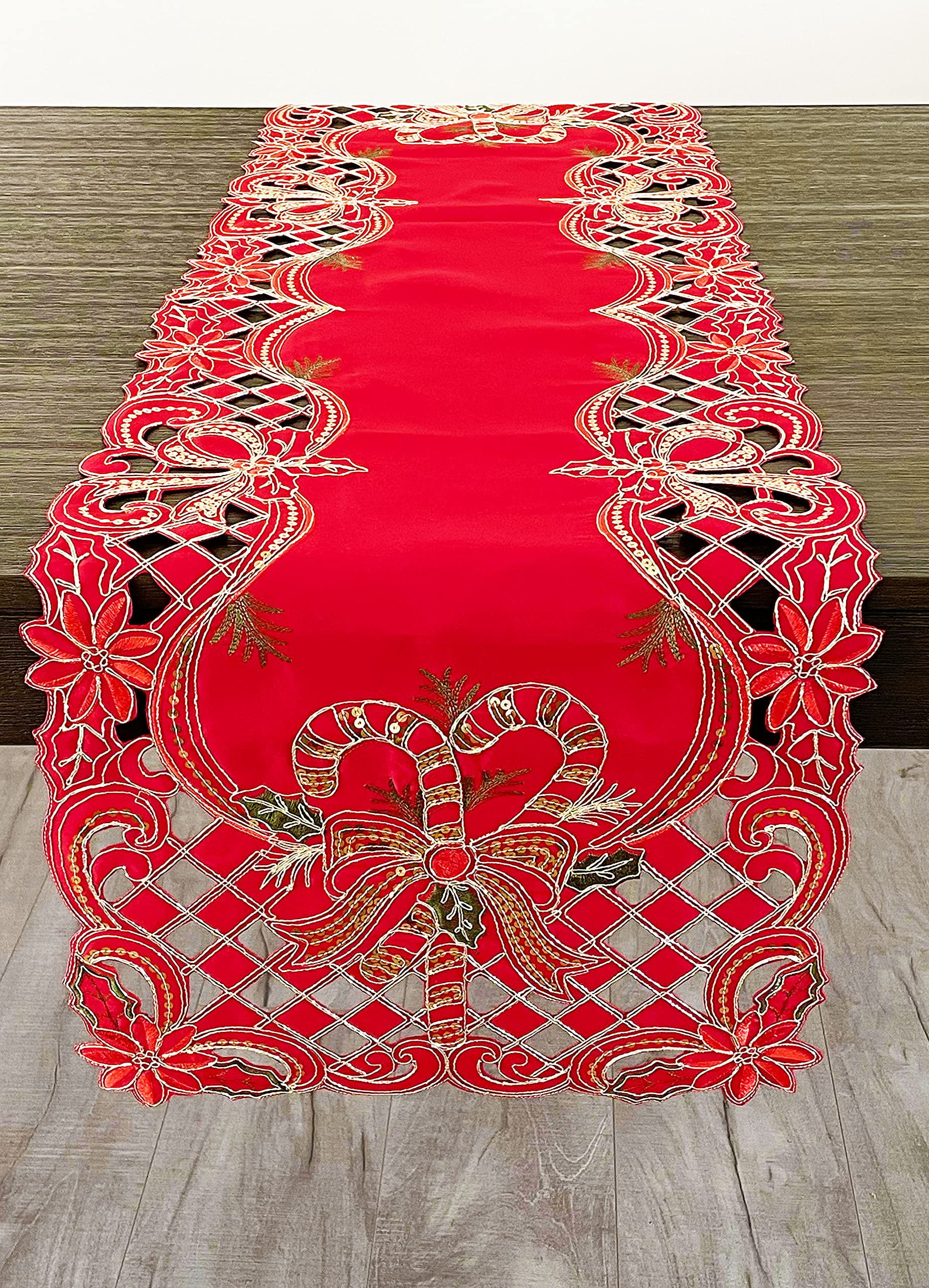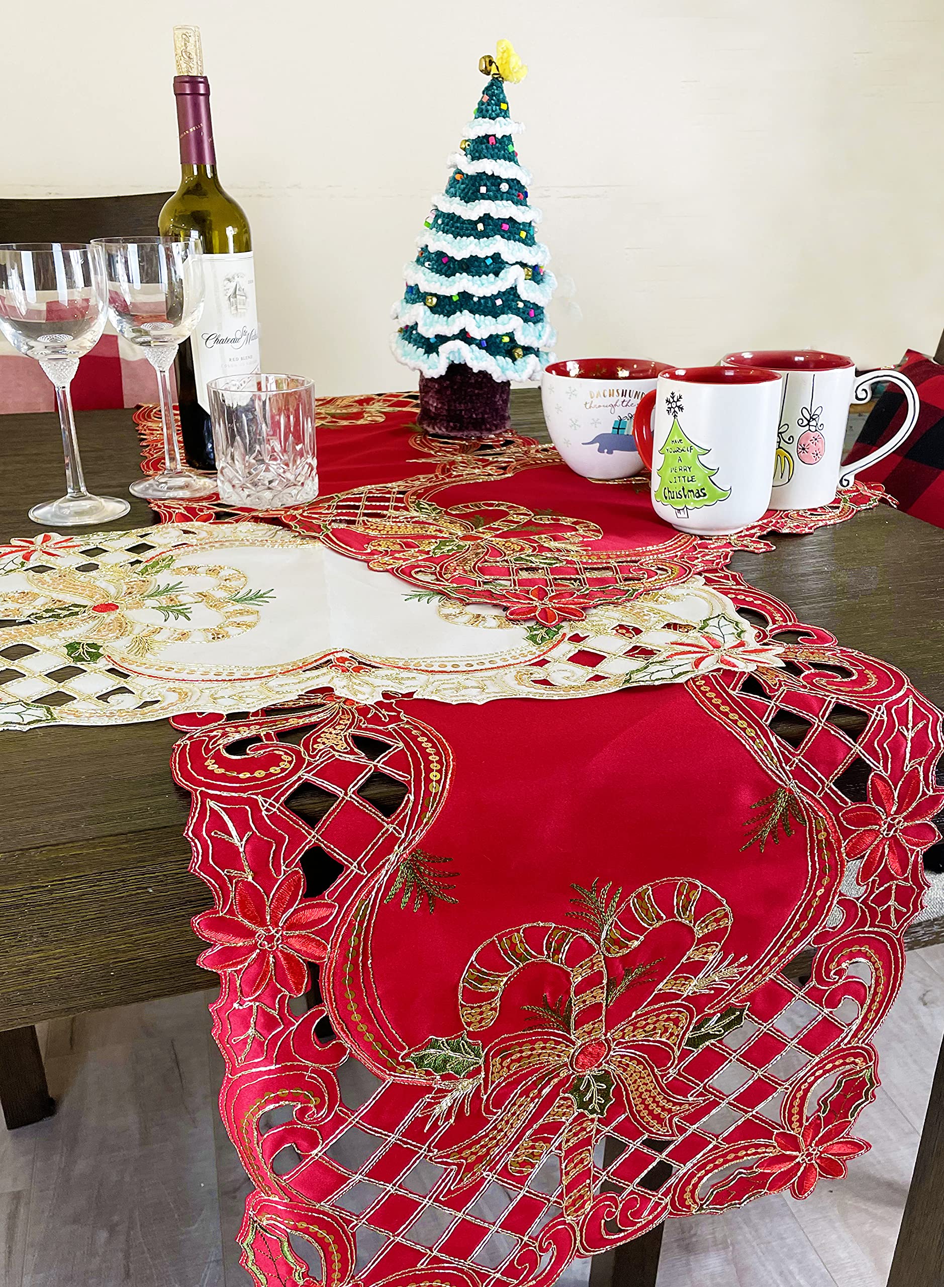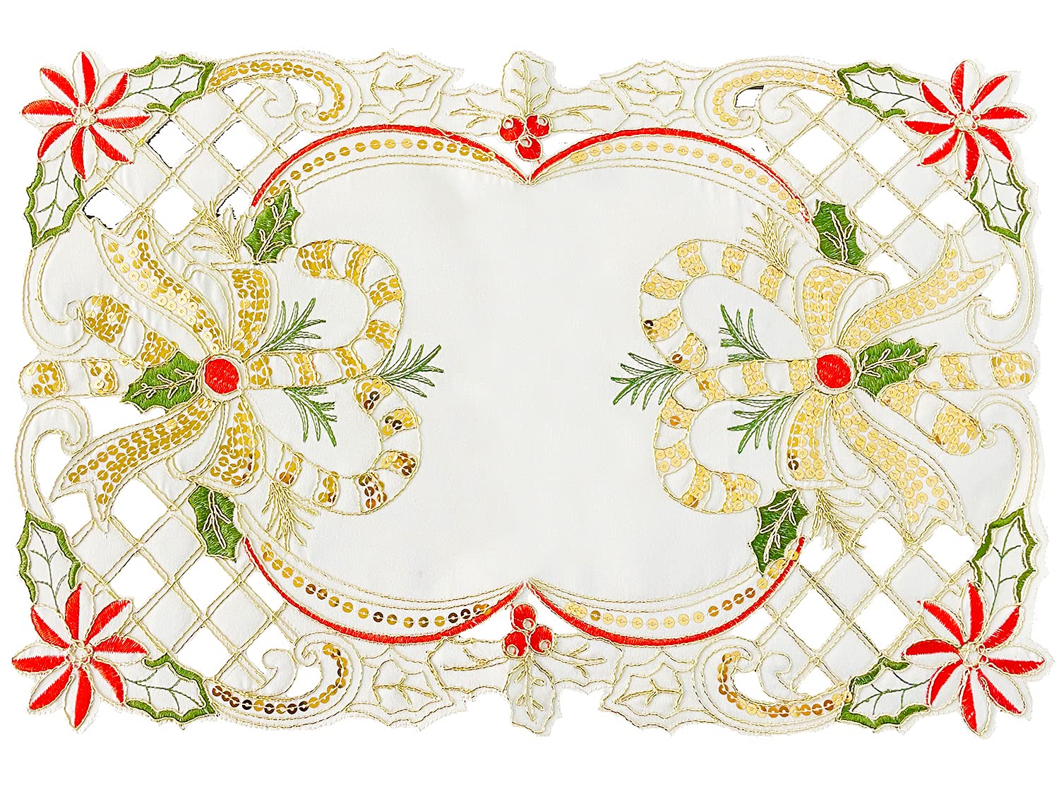 - RED CHRISTMAS EMBROIDERED & SEQUIN CUTWORK PLACEMATS, SET OF 4 – Bring holiday touch to your dining room with these glam Holiday Embroidered Cutwork Placemats! Featuring shimmering sequin and embroidery stitch design in candy cane, ribbon, holly and poinsettia adds a festive look to your table, while beautiful cutwork along the edges for a delicate, Christmas charm effect. It's perfect for any table and coordinating with a matching table runner to create a cohesive look.