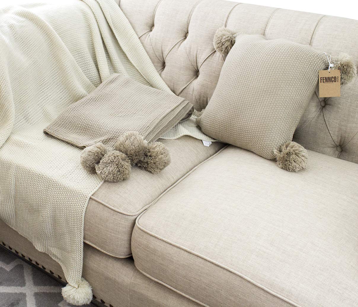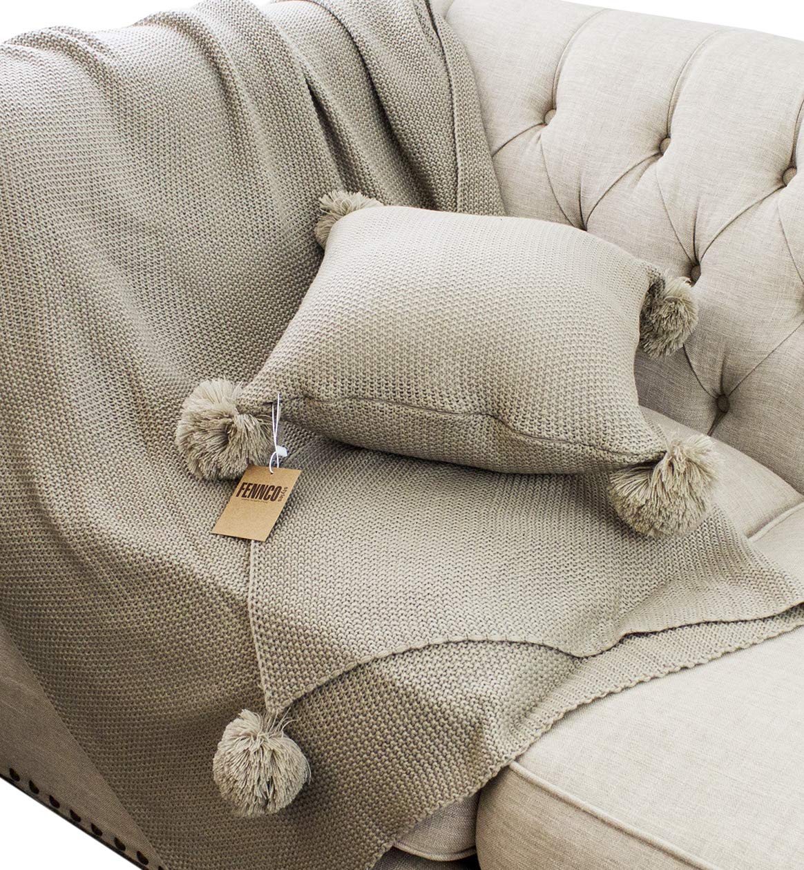 Details: This chunky knit throw features fun pom poms for a playful style. Pom pom details at each corner. The throw comes in on-trend brown and natural, perfect for any modern living space. This cozy chunky knit blanket is ideal for use on furniture such as couches, beds and sofa beds.