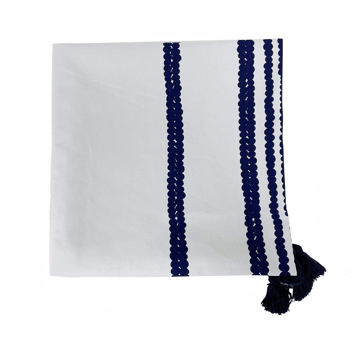 - BEADED CHAIN PRINT COTTON TABLECLOTH – Bring a touch of style to your table setting with the Beaded Print Cotton Tablecloth. Boasting a beautiful beaded chain pattern in a blue tone palette lends a touch of modern style, finished with a tassel design adding a delicate and beautiful classic style. This unique print tablecloth is the perfect choice for your everyday use and family gathering and casual dining décor.