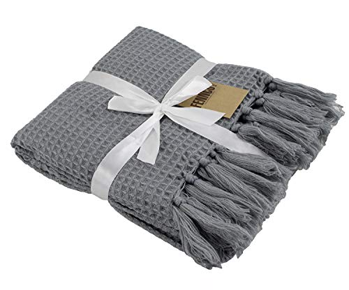 Fennco Styles Classic Waffle Weave Tassel Trim 50 x 60 Inch Throw - Grey Throw Blanket for Couch, Bedroom and Living Room Décor