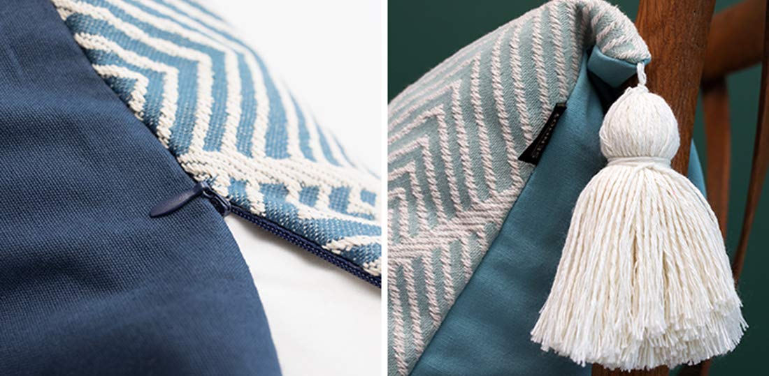 - CHEVRON DECOR PILLOWS - Dress up your interior while adding comfort to your space with this chevron throw pillow. Hight quality, long-lasting use, the chevron pattern is elevated with navy blue embroidery to add a splash of color to your space, tassel accents adorn on one corner for a tasteful touch of texture. Easily to mix and match with other cushions for a layering effect.
