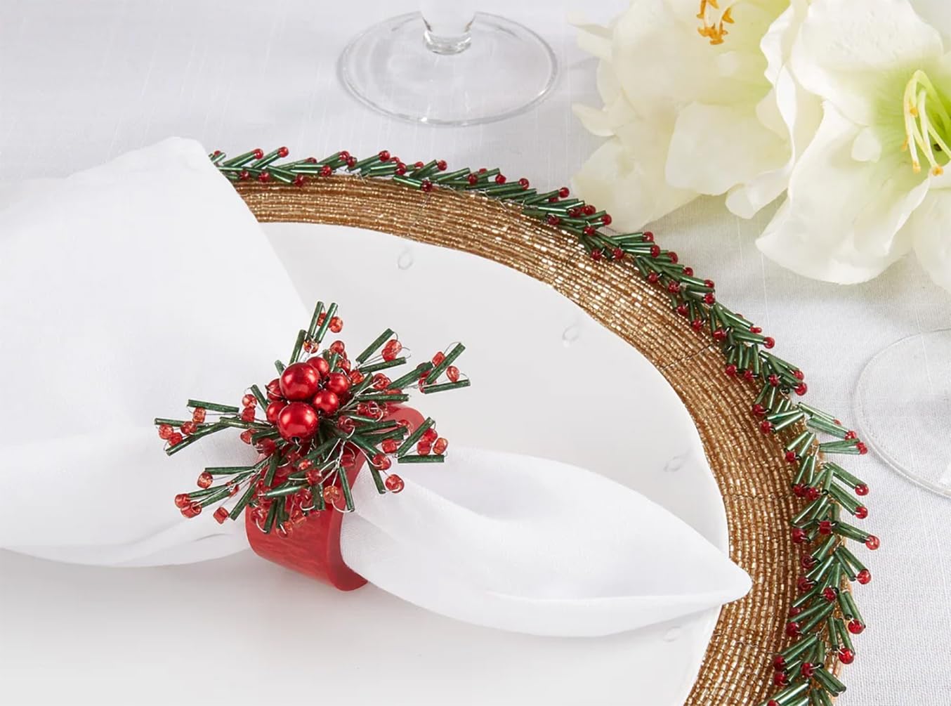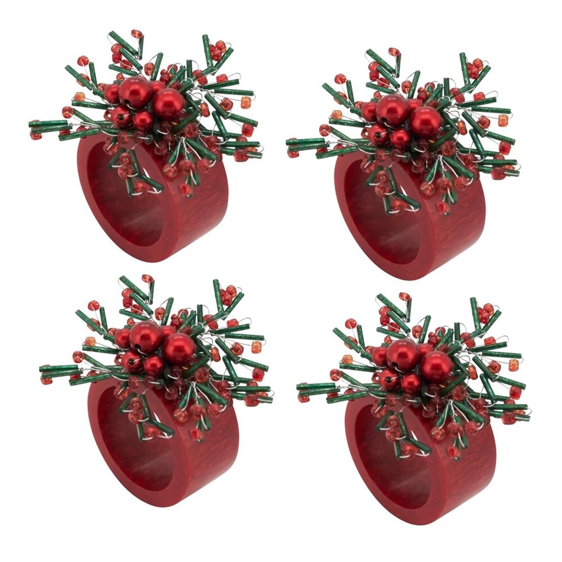 - 4PK FINERY BEADED NAPKIN RINGS – Add a touch of holiday cheer to your table setting with these Finery Beaded Holiday Napkin Rings. The intricate beading in traditional hues of green and red glass beads catches and reflects light for a glittering effect adding sparkle and glitz to each table setting, their adorable round shape ensures they stand out as a captivating addition to your holiday celebrations. These unique napkin rings are best suited for Christmas dinners and seasonal gatherings.