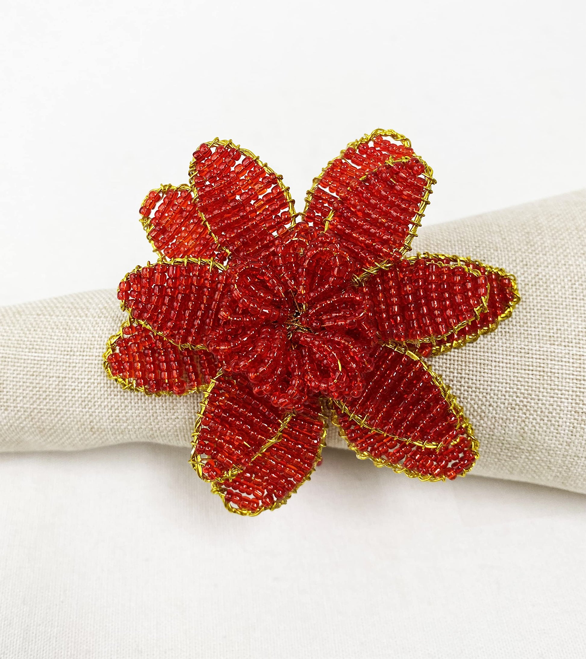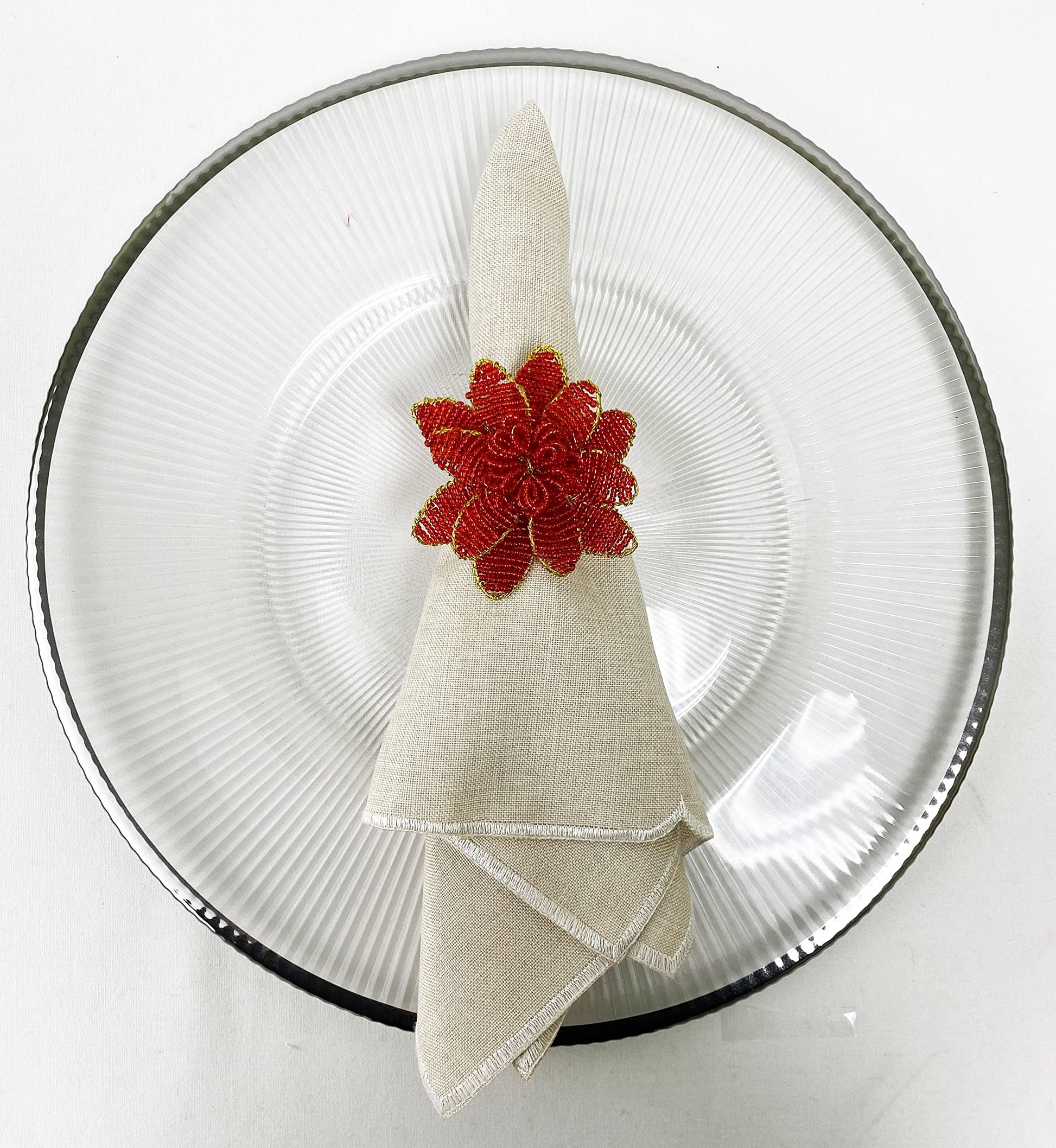 - BEADED CHRISTMAS POINSETTIA 4 NAPKIN RINGS – Add a splash of color and joy to your traditional holiday table décor with the Beaded Poinsettia Napkin Rings. Featuring handcrafted, small, refined glass beads that bring a dash of shimmer to complete your place setting. The elegant design with beaded construction makes these flower napkin rings are the perfect piece for Christmas parties, family gatherings to formal events. Pair with light colors and crisp fabrics like linen for a cohesive look.