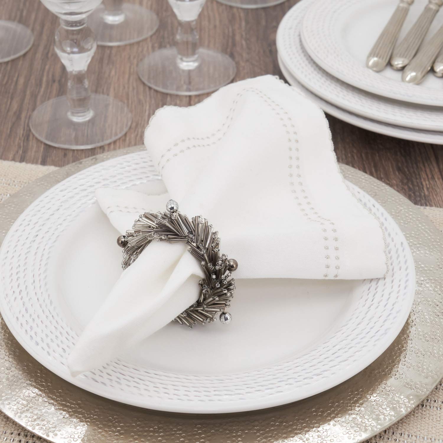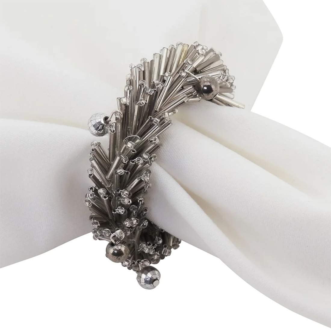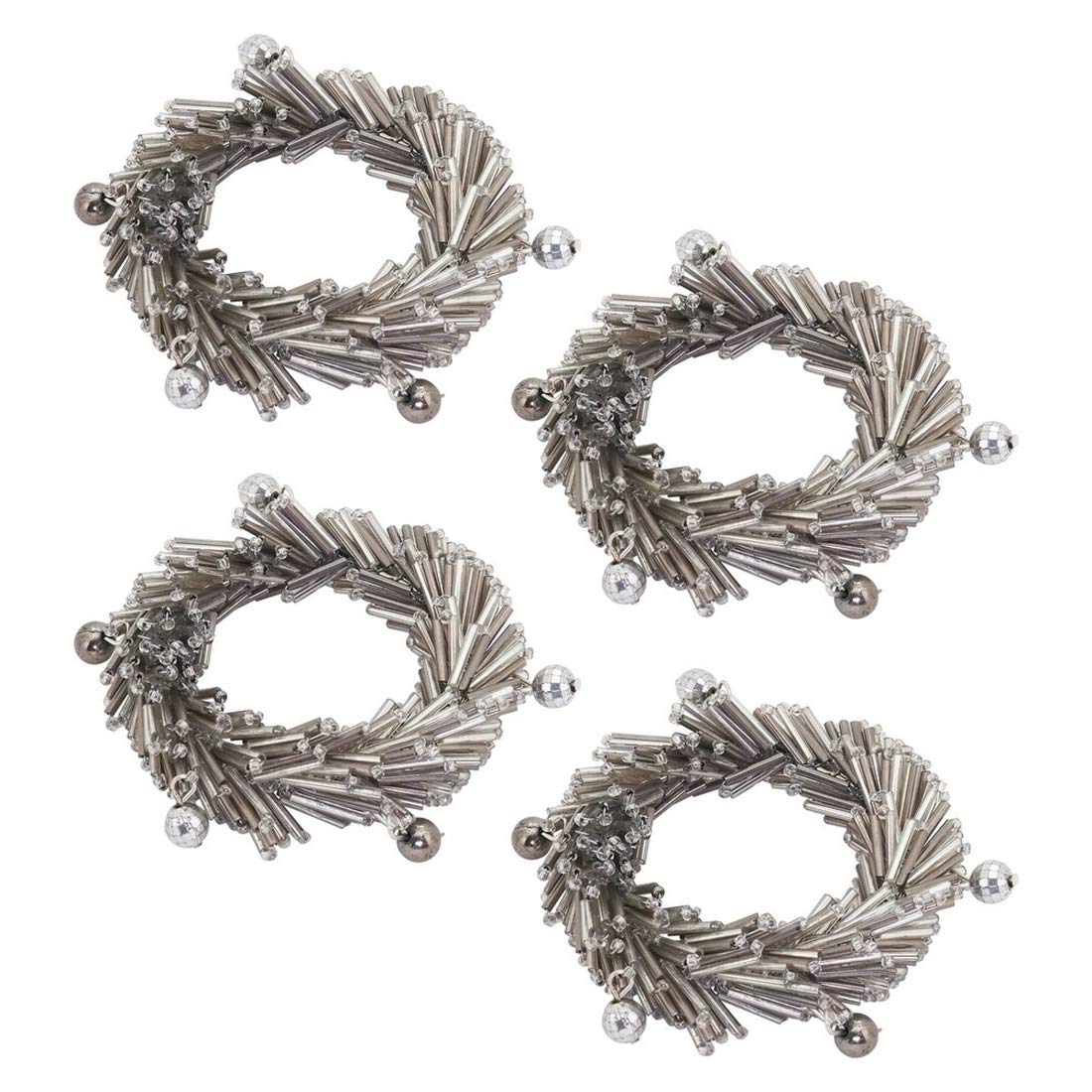 - HAND BEADED NAPKIN RINGS, SET OF 4 – Add the shimmer finishing touch to your table setting this Hand Beaded Napkin Rings. Featuring silver metallic beads catching and reflecting light for a glittering effect, which the mini jingle bells bring festive charm to the design. The rich design brings texture to your tabletop, it can be easily dressed up or down. Coordinates easily with a variety of linens and brings a hint of shimmer for the holiday season.