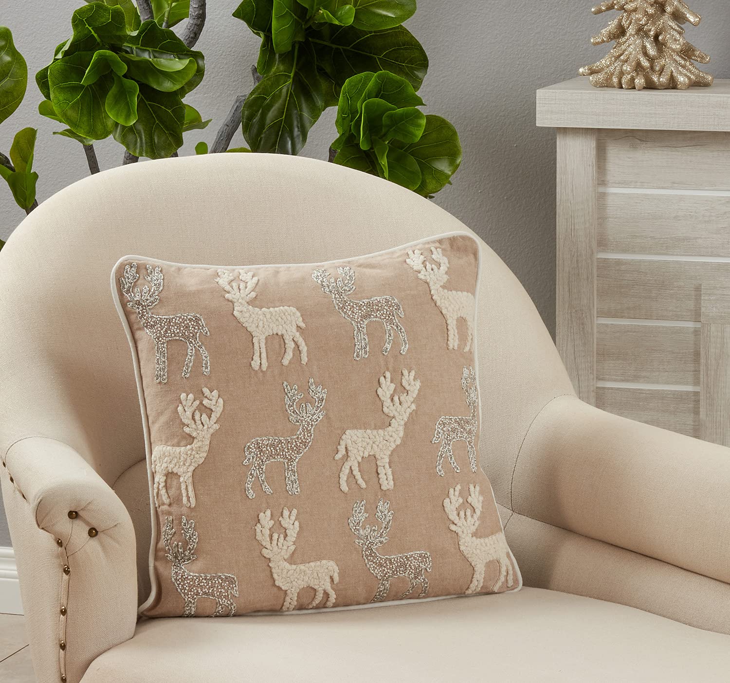Fennco Styles Hand Beaded & Embroidered Reindeer Cotton Decorative Throw Pillow 18" W x 18" L – Natural Holiday Cushion for Home, Couch, Sofa, Bedroom, Office, Christmas Décor and Special Occasion