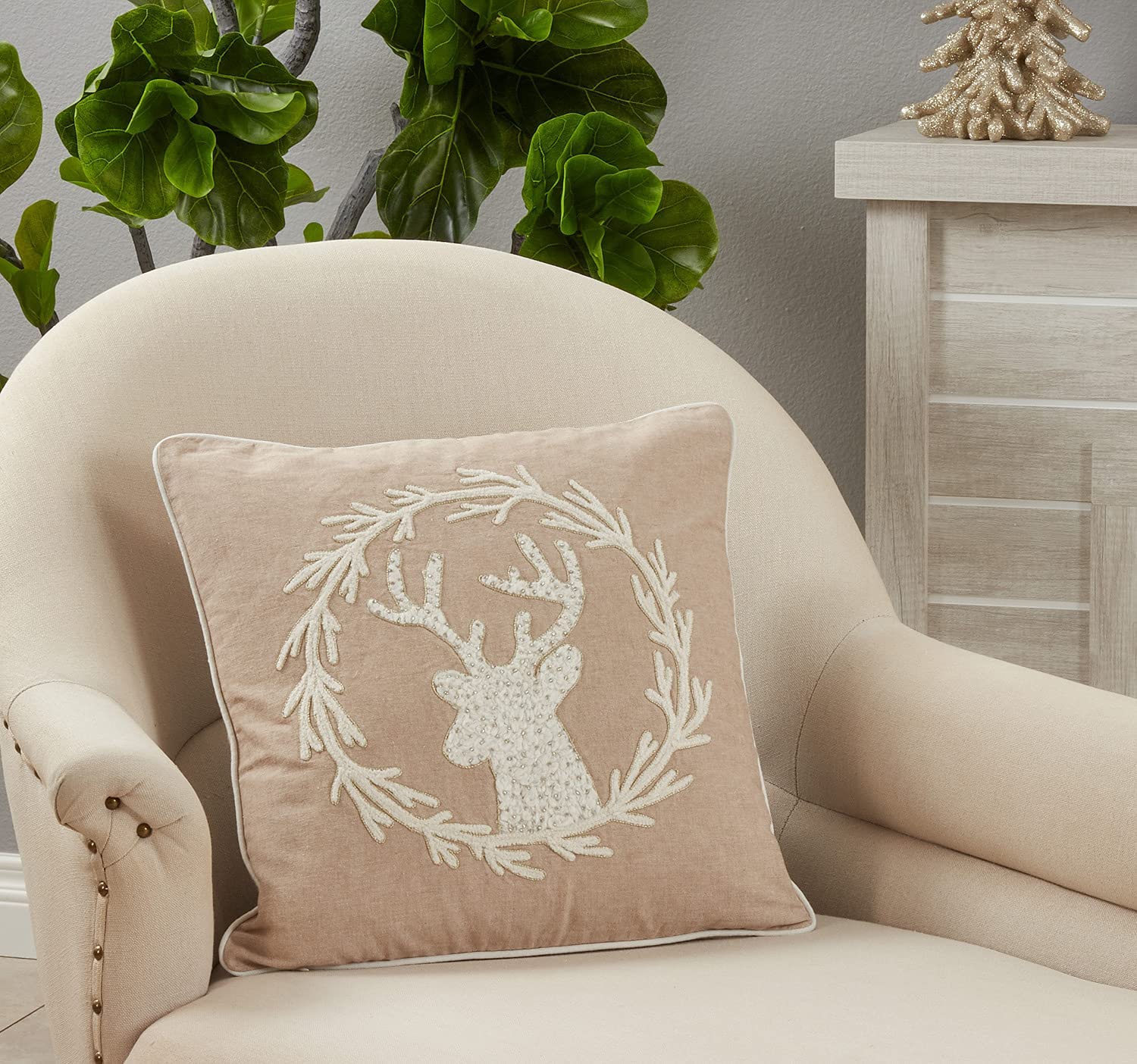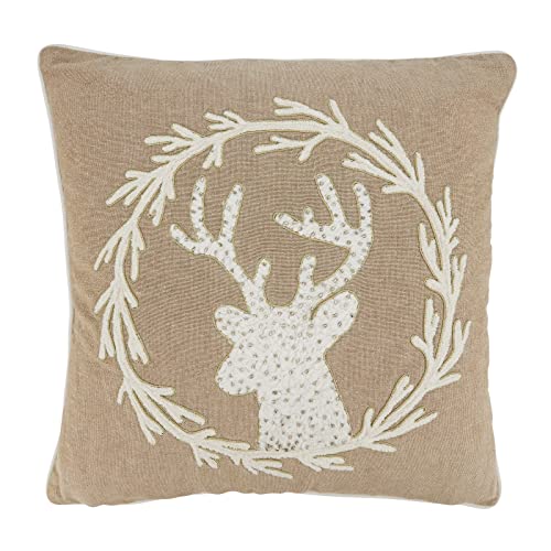 Fennco Styles Hand Beaded & Embroidered Wreath Reindeer Cotton Decorative Throw Pillow 18"W x 18"L – Natural Holiday Cushion for Home, Couch, Sofa, Bedroom, Office, Christmas Décor and Special Occasion