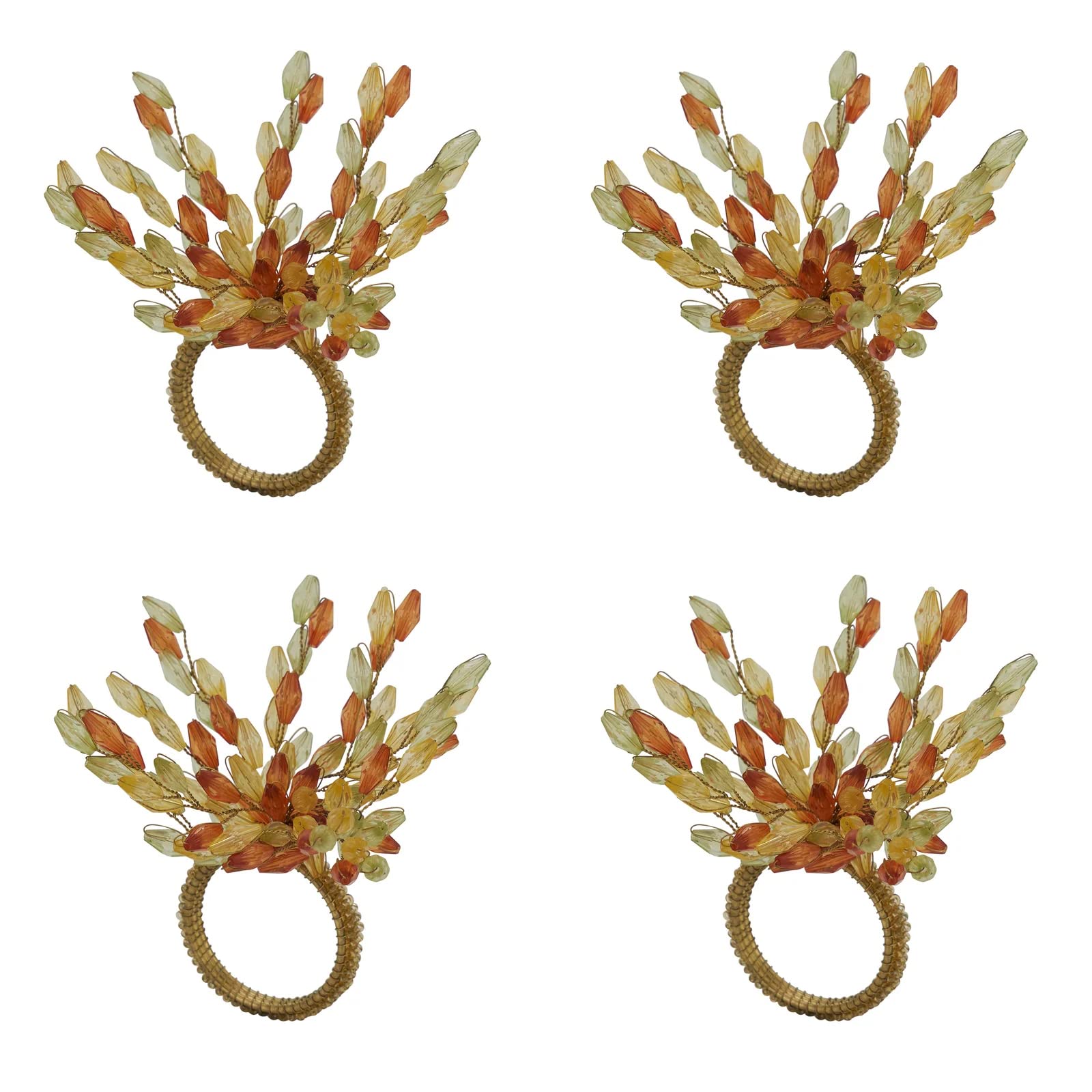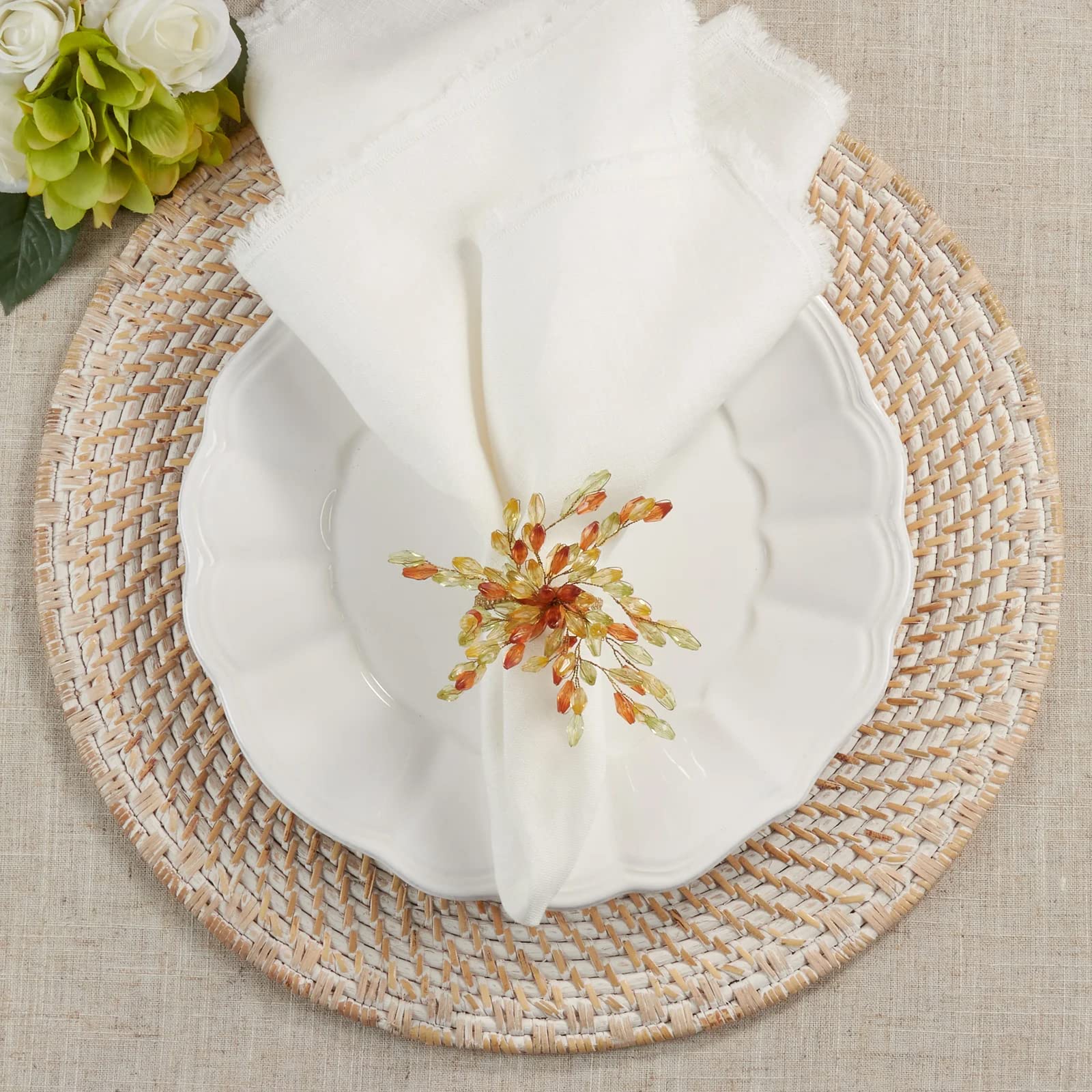 - HAND BEADED FLOWER NAPKIN RINGS, SET OF 4 – Dress your napkins and dinner tablescape in style with these Hand Beaded Flower Napkin Rings. Design with a beautiful combination of acrylic and glass beads in multicolor with allover beaded detailing adds decorative and functional flair to your dining table décor, which catches and reflects light for a glittering effect. These unique glass beads napkin rings are best suited for entertaining, seasonal gatherings and special occasions.
