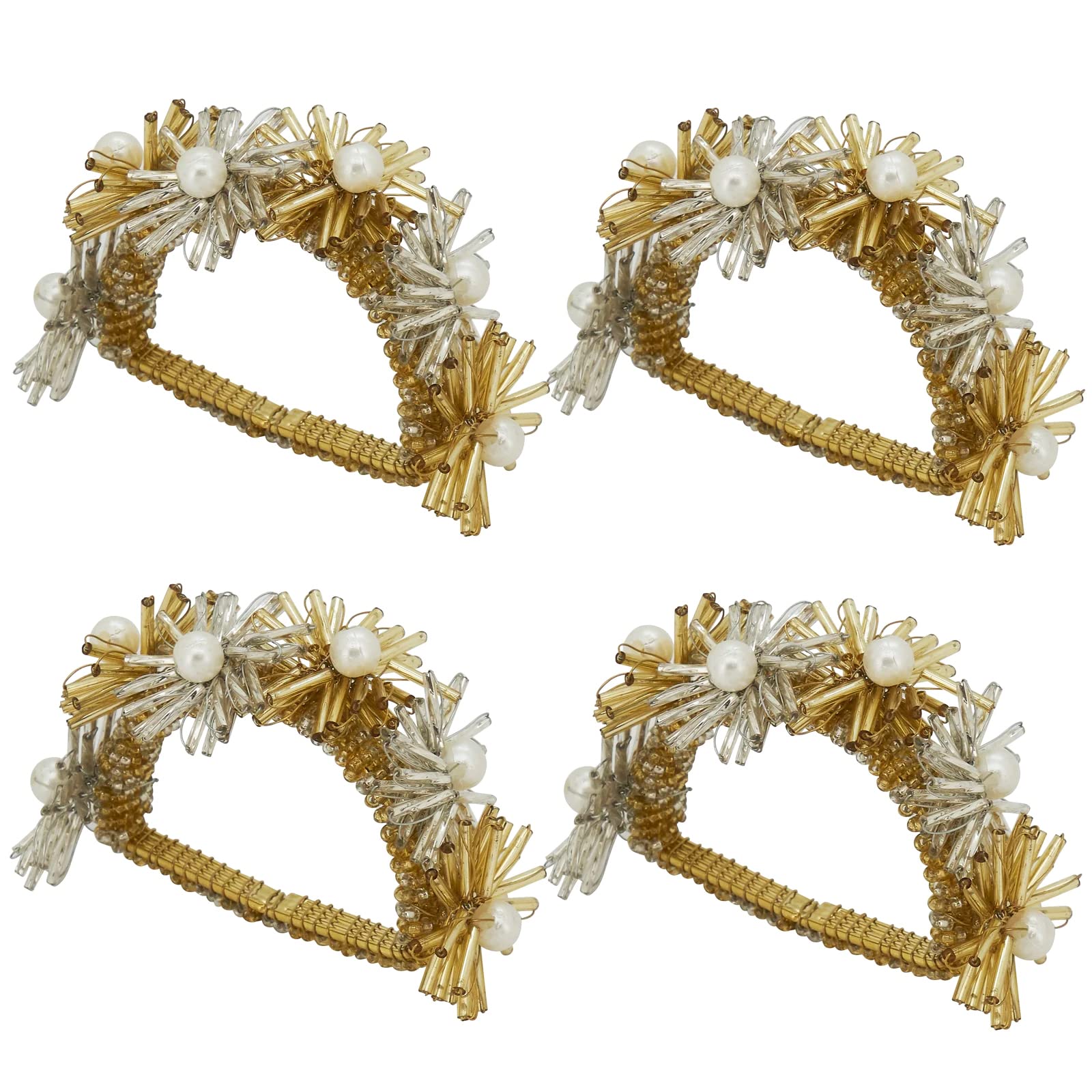 Fennco Styles Hand Beaded Flower Metal Napkin Rings, Set of 4 - Glass Beads Napkin Holders for Christmas, Home, Dining Room, Banquet, Family Gathering, Holiday and Special Occasion