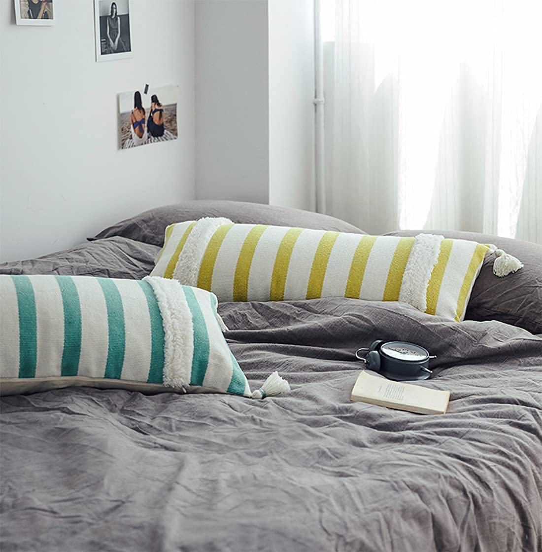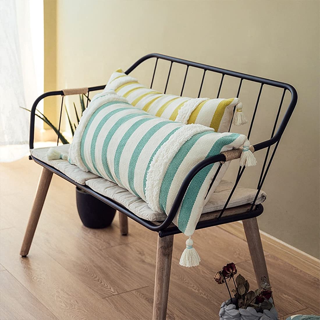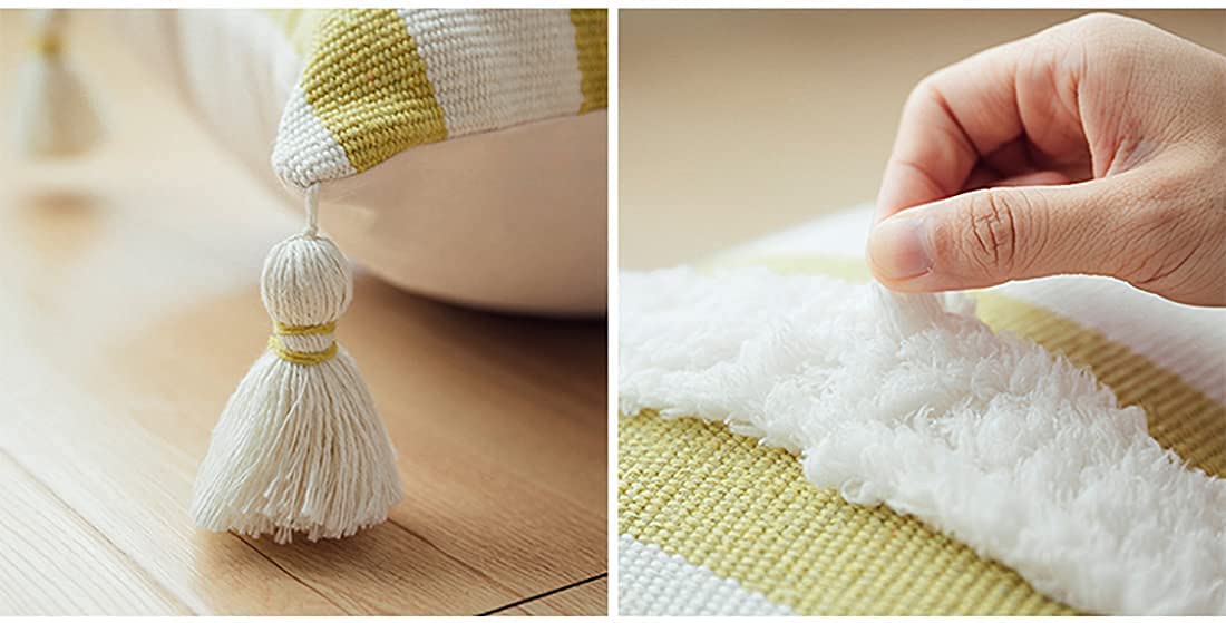 - HANDCRAFTED TUFTED STRIPED PRINT THROW PILLOW – Refresh your home décor with this Tufted Striped Lumbar Throw Pillow. It features a white breathable cotton blend cover with vibrant green stripes for a timeless look, along with a hand-tufted and decorative corner tassels to add a touch of playful texture. The plump-filled insert offers comfortable lounging, use it over your sofa or armchair in the living room, or throw it over the bed to brings a comfortable look and feel. Solid on the back.