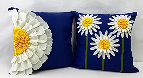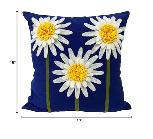 Fennco Styles Handmade 3D Felt Sunflowers Cotton Canvas Decorative Throw Pillow 18" W x 18" L - Navy Blue Floral Cushion for Couch, Bedroom and Living Room Décor