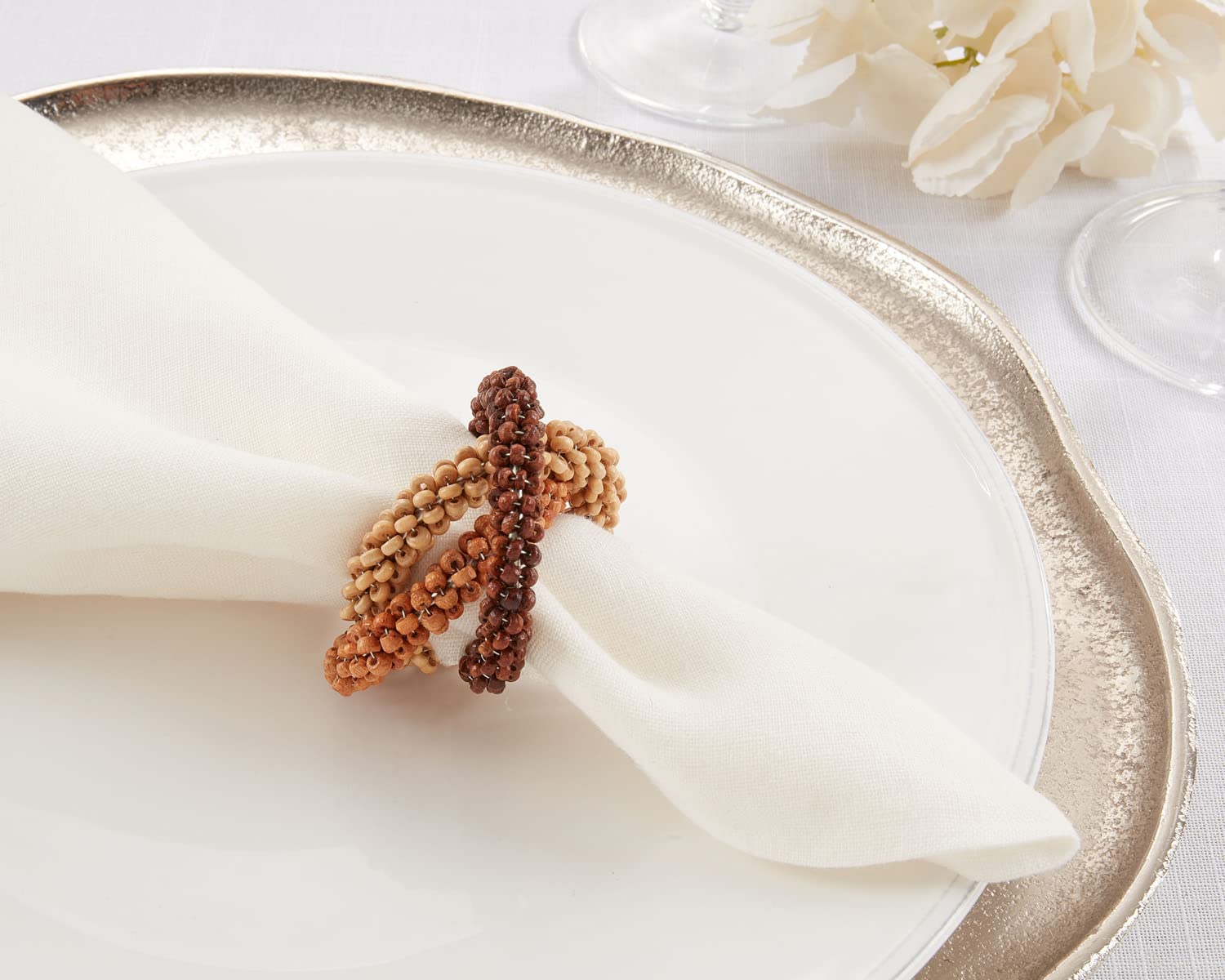 - 4PK BEADED INTERLOCK NAPKIN RINGS – Let nature inside your dining table with these beautiful and stylish Hand Beaded Interlock Napkin Rings. Features allover beaded detailing and interlocking design bring texture and visual interest to any place setting, and the natural wooded beads lend such an organic and modern style. The natural tone makes it very easy to pair with a wide range of table linens and dinnerware, they are the perfect finishing touch for casual hosting and everyday dining.