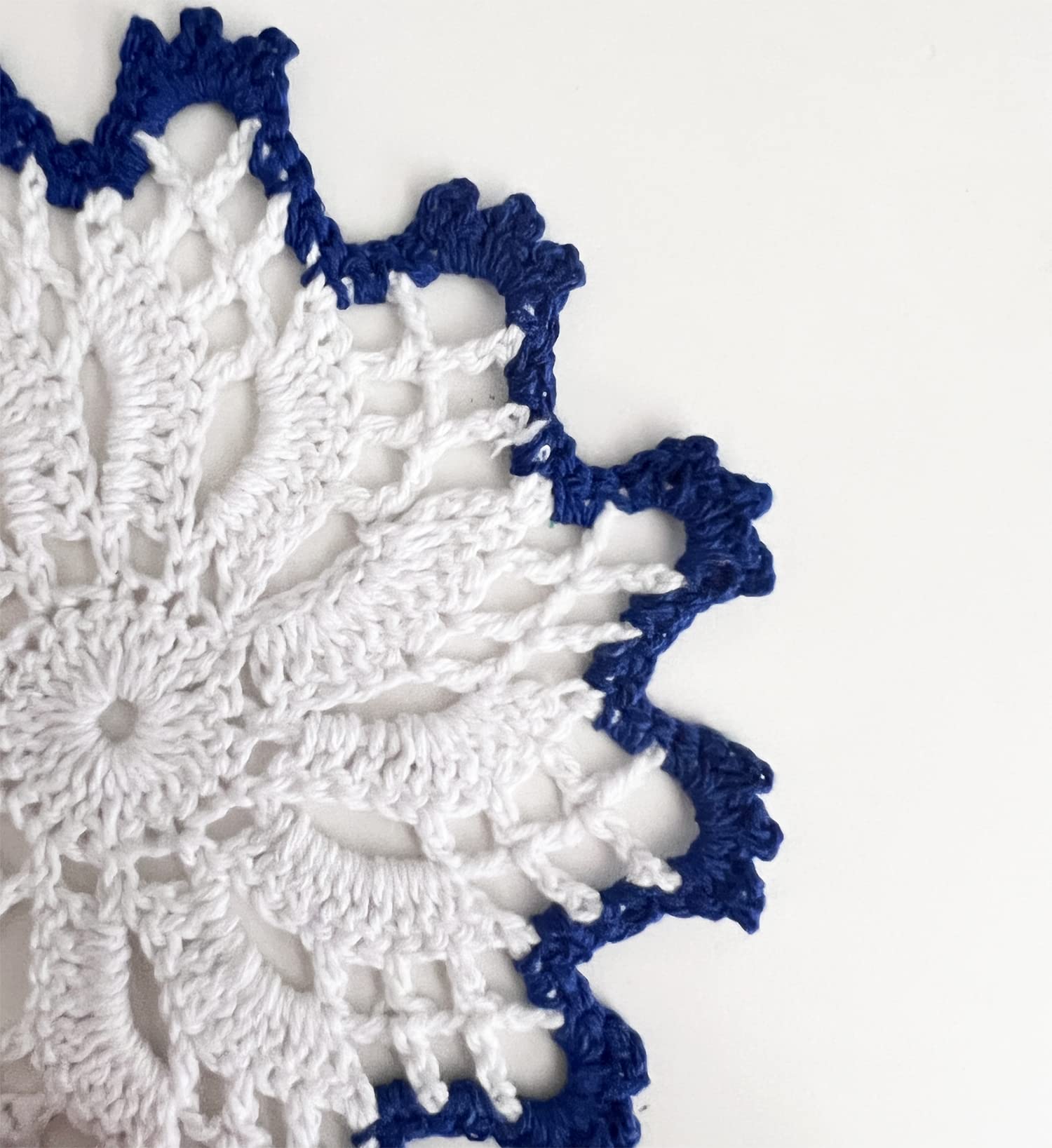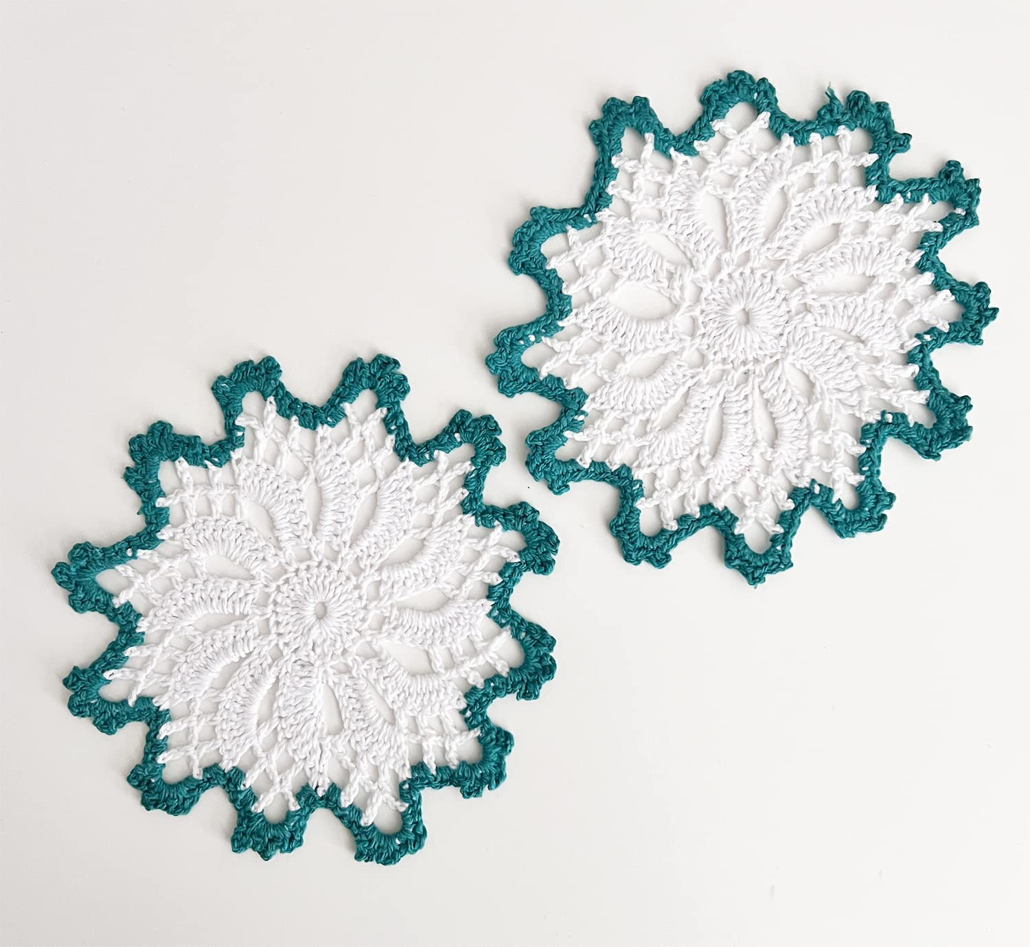 - 1PK HANDMADE CROCHET DOILY – Adorn your table setting with a touch of everlasting charm using the Handmade Crochet Whirlwind Doilies from Fennco Styles. These cloth coasters offer a refined and reusable way to protect surfaces and any table décor. It features a delicate crochet whirlwind pattern in white and finishes with an aqua border creating a rustic texture and easy to mix well with various patterns. Great for placing on dressers, nightstands, and other furniture around the home.