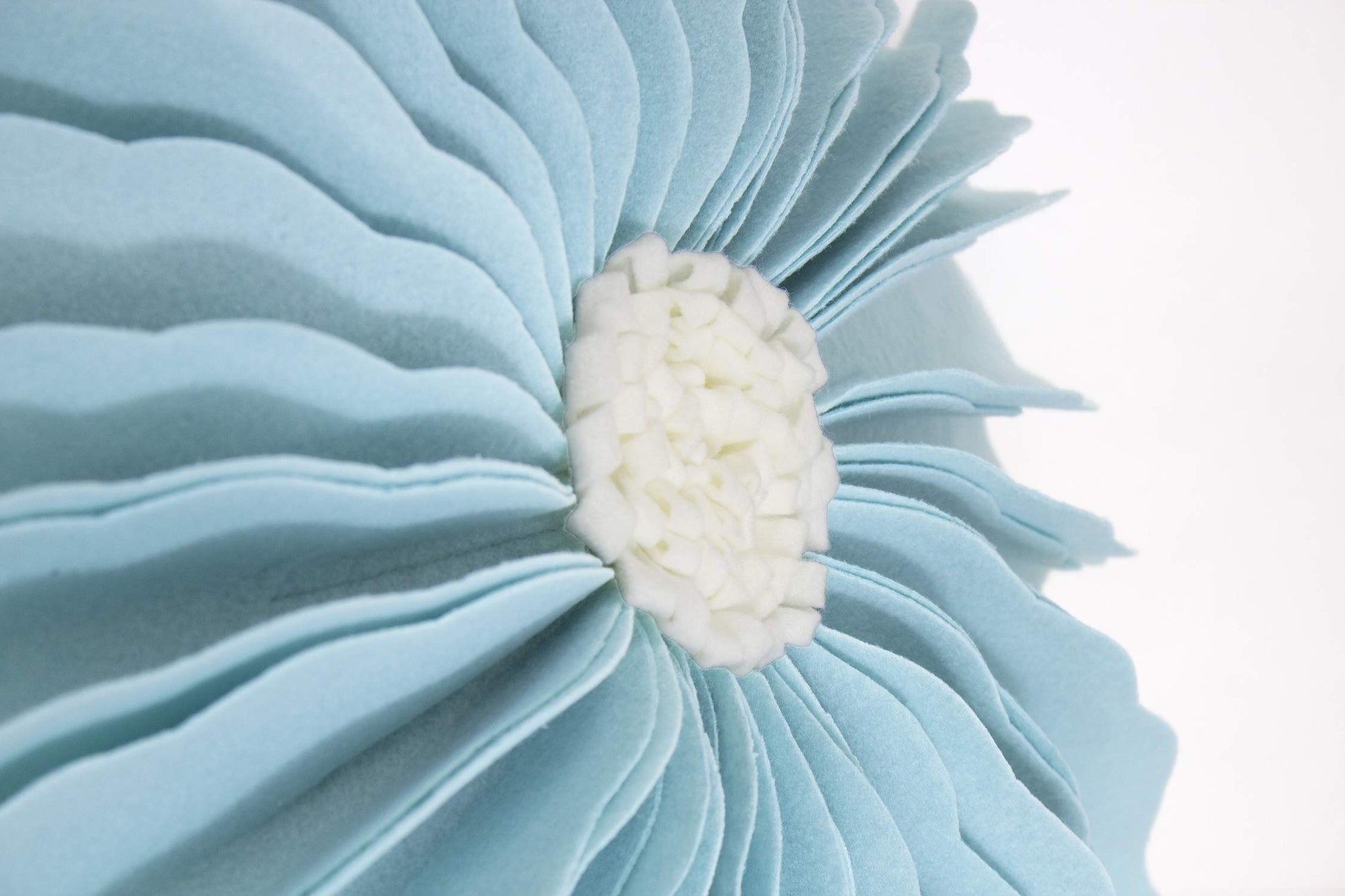 - AQUA THROW PILLOW - Featuring elegant layers of polyester felt petals formed into a 3D Sunflower, the solid back add a cozy touch while the round shape and pastel hue make it easy to incorporate as an accent in your home decor. These unique garden 3D decorative pillows are the perfect choice for tasteful decoration of your living room or bedroom.