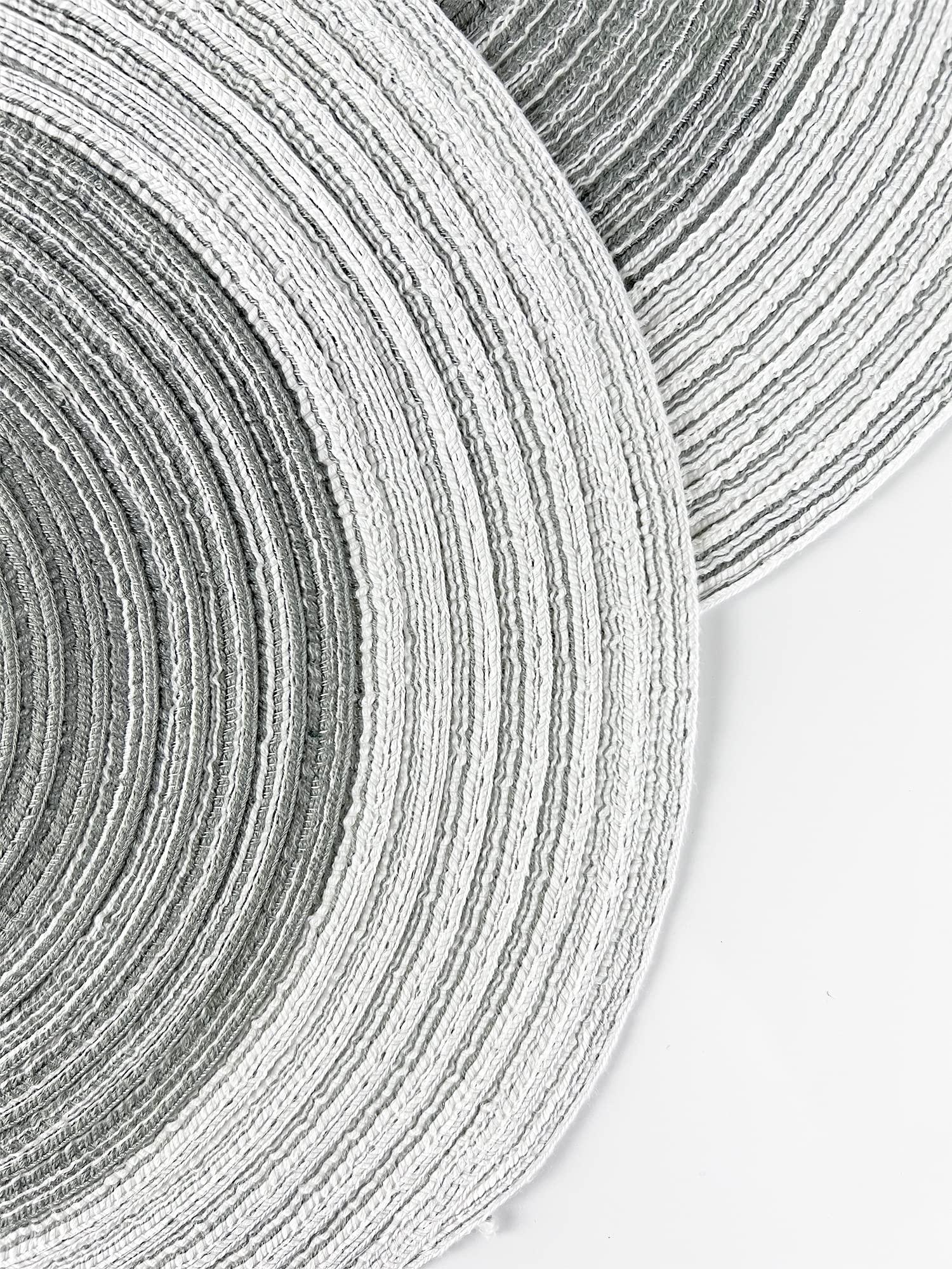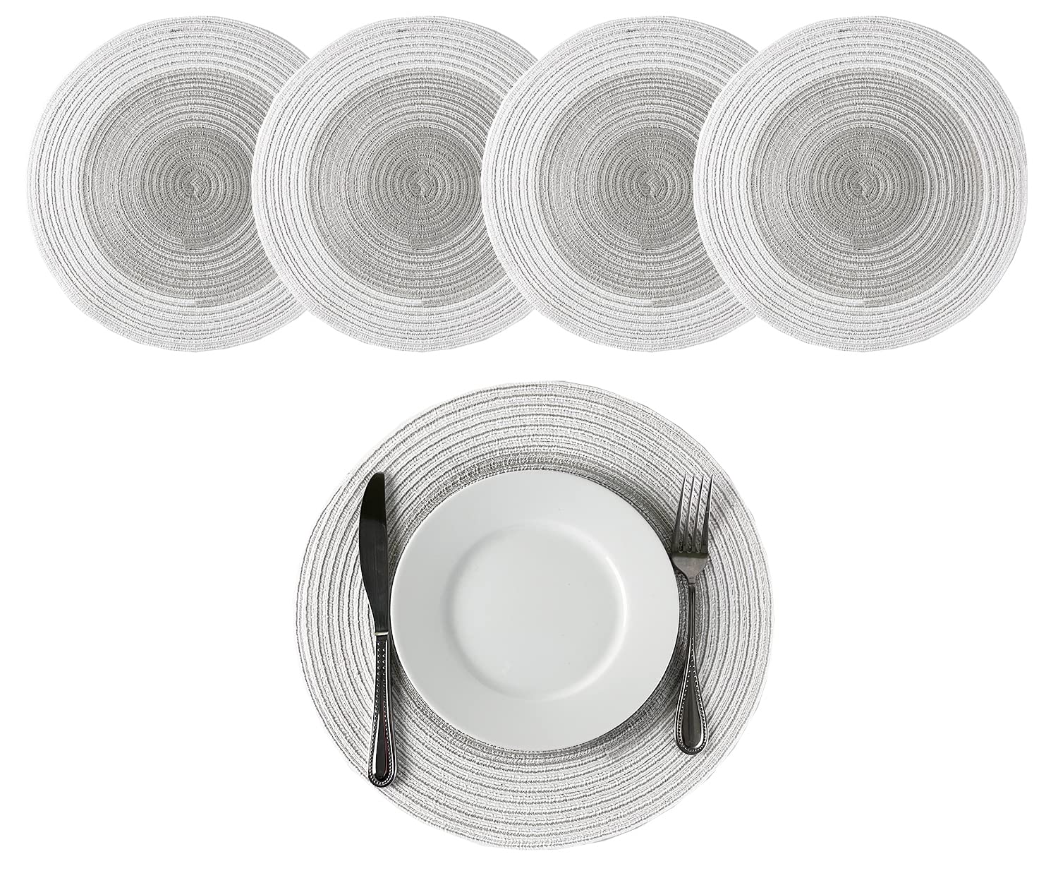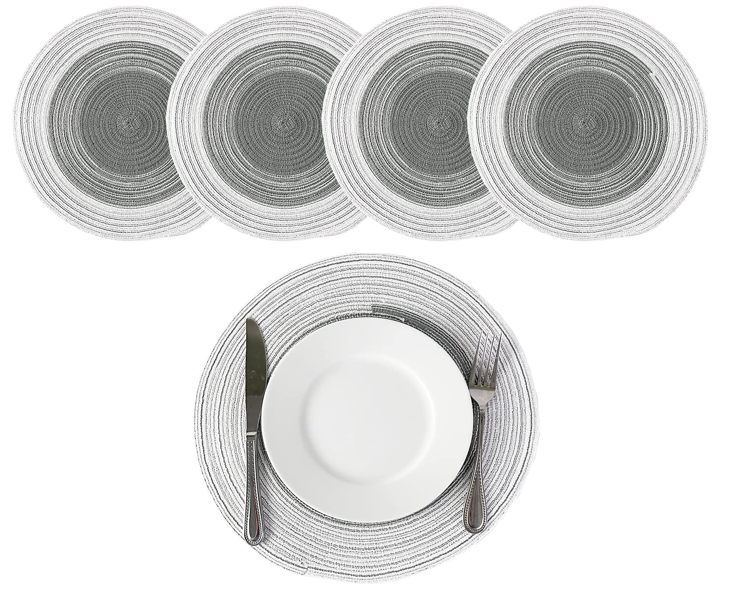 - 4PK GRADIENT BRAIDED ROUND PLACEMATS – Protect and dress up your table with these Gradient Braided Round Placemats. It showcases a hand-braided construction and gradient color design to lend a textured, stylish look to any place setting. These ramie table mats help to protect your tabletop from scuffs, messes, and hot dishes and are perfect for everyday décor, and casual dinner parties during the holiday season. Or use it as a base under vases and small potted plants atop your end table.