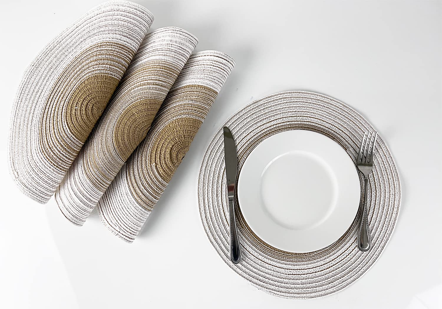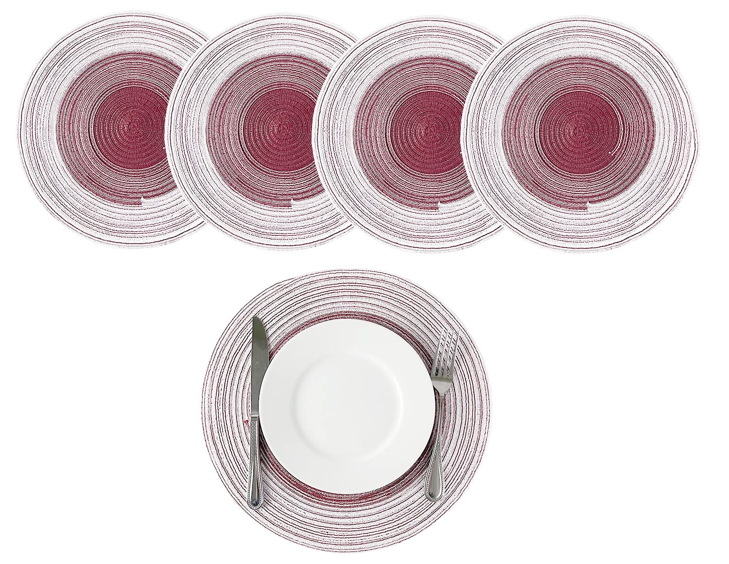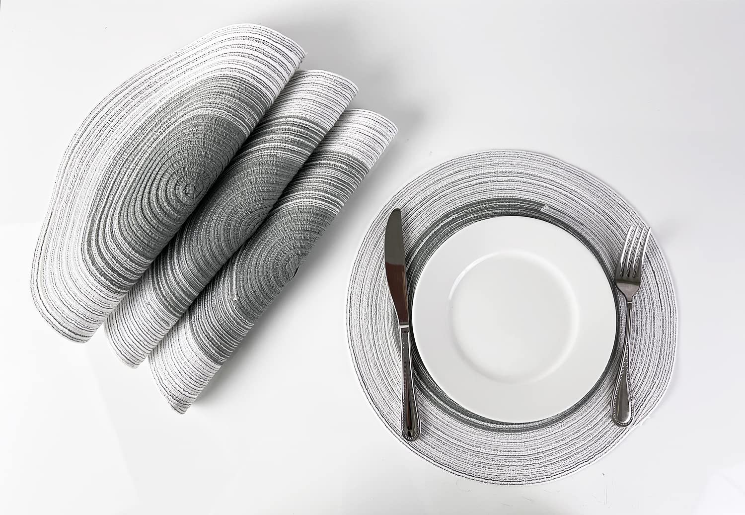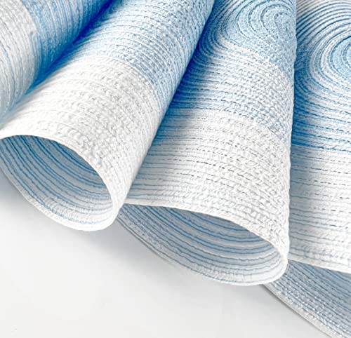 - 4PK GRADIENT BRAIDED ROUND PLACEMATS – Protect and dress up your table with these Gradient Braided Round Placemats. It showcases a hand-braided construction and gradient color design to lend a textured, stylish look to any place setting. These ramie table mats help to protect your tabletop from scuffs, messes, and hot dishes and are perfect for everyday décor, and casual dinner parties during the holiday season. Or use it as a base under vases and small potted plants atop your end table.