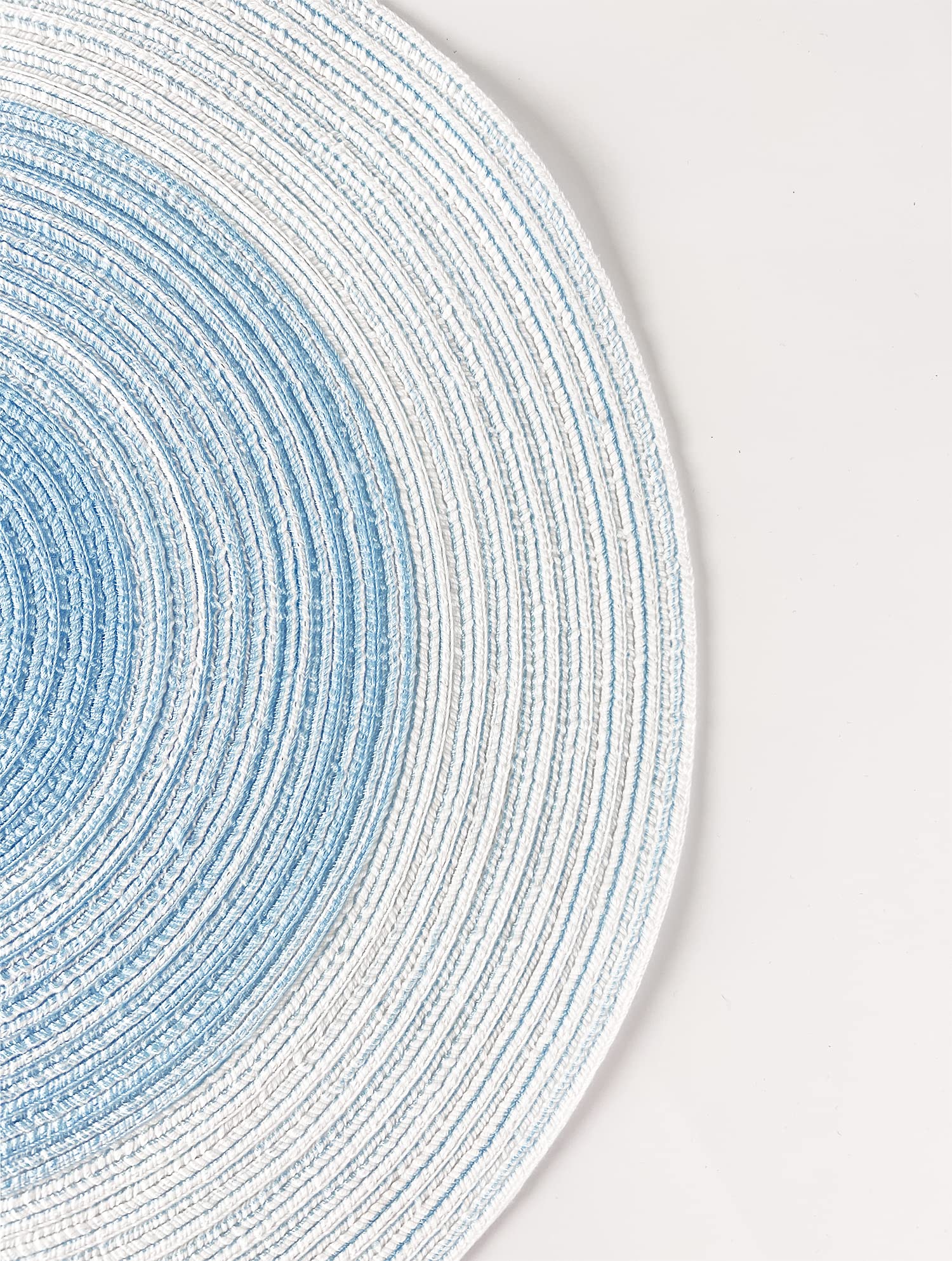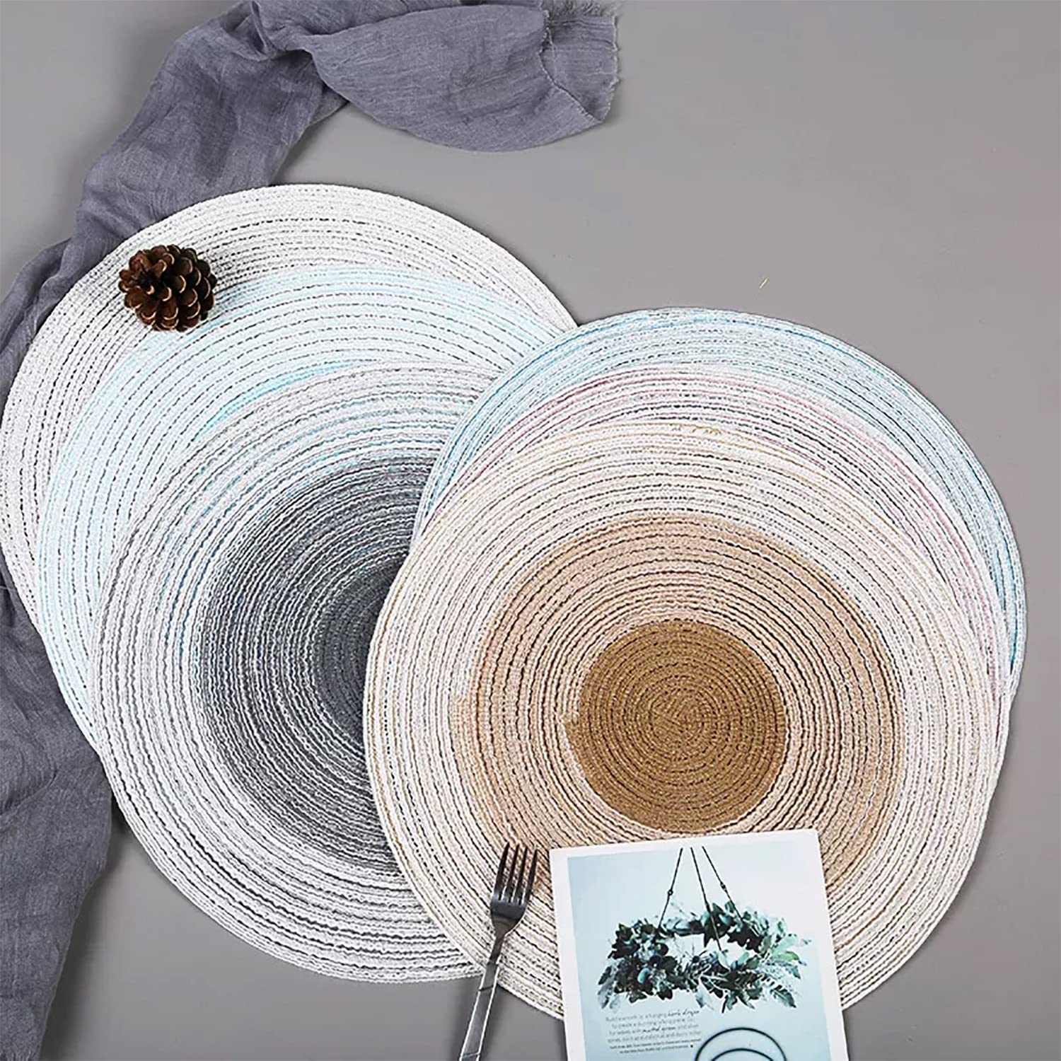 - MULTI-PURPOSE UTILIZATION – The Braided Gradient Round Placemat brings a refreshing touch to your dining table. Use it to decorate indoor/outdoor parties and banquets, or use it inside when hosting casual or holiday meals for friends and family which is perfect for everyday use, or pair it with your existing décor to create a rustic chic dining table décor. Great for entryway tables, low bookshelves, dining tables, or other surfaces of your home as well.