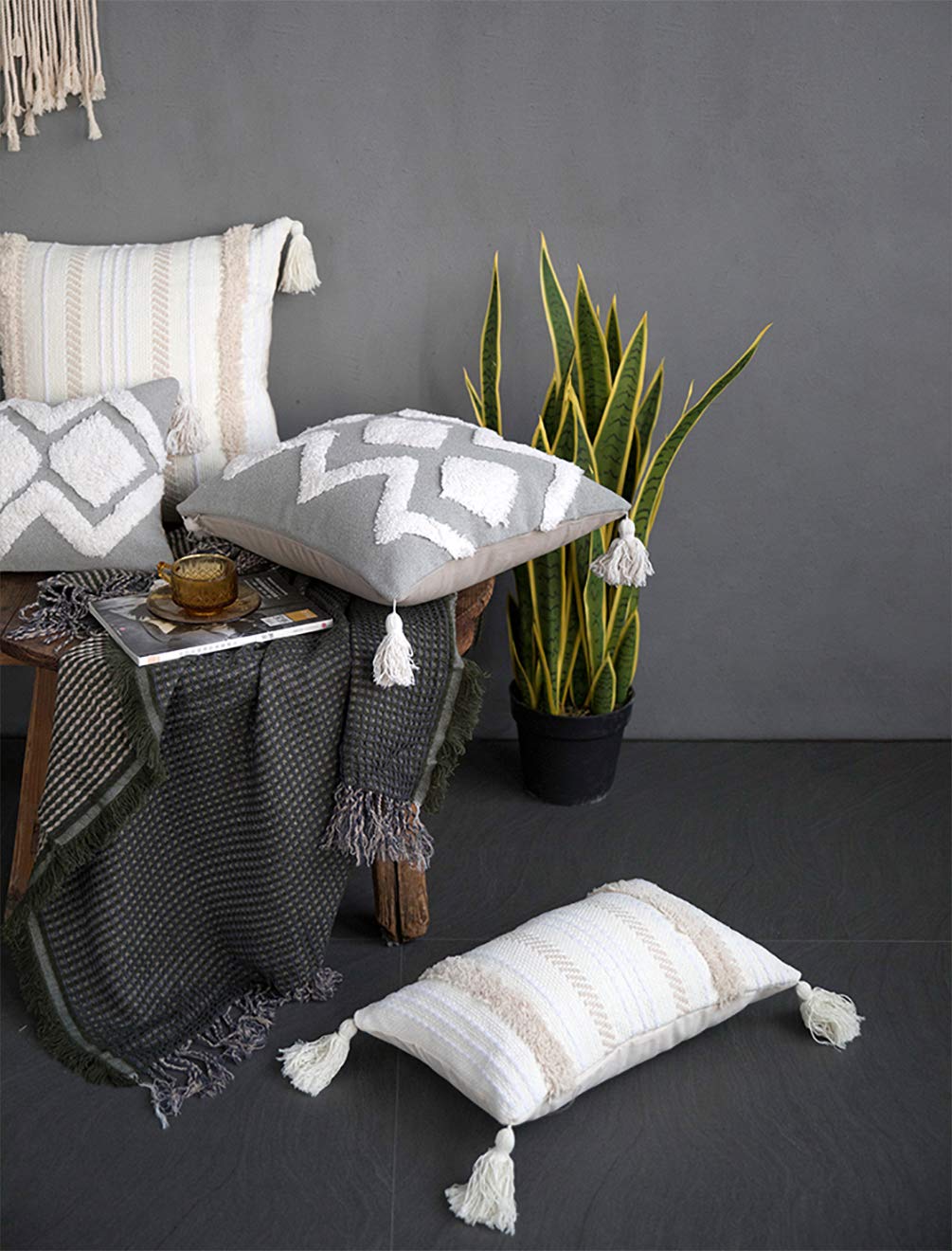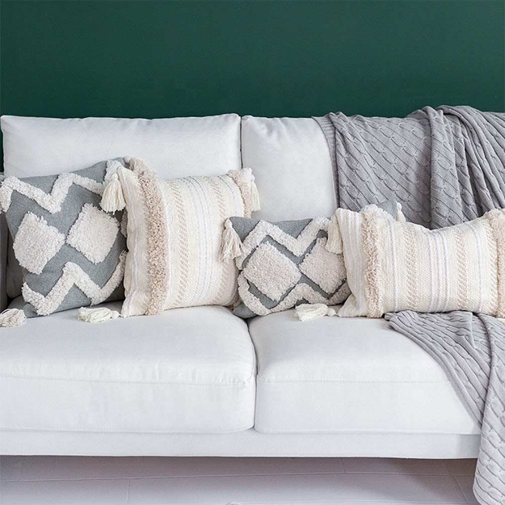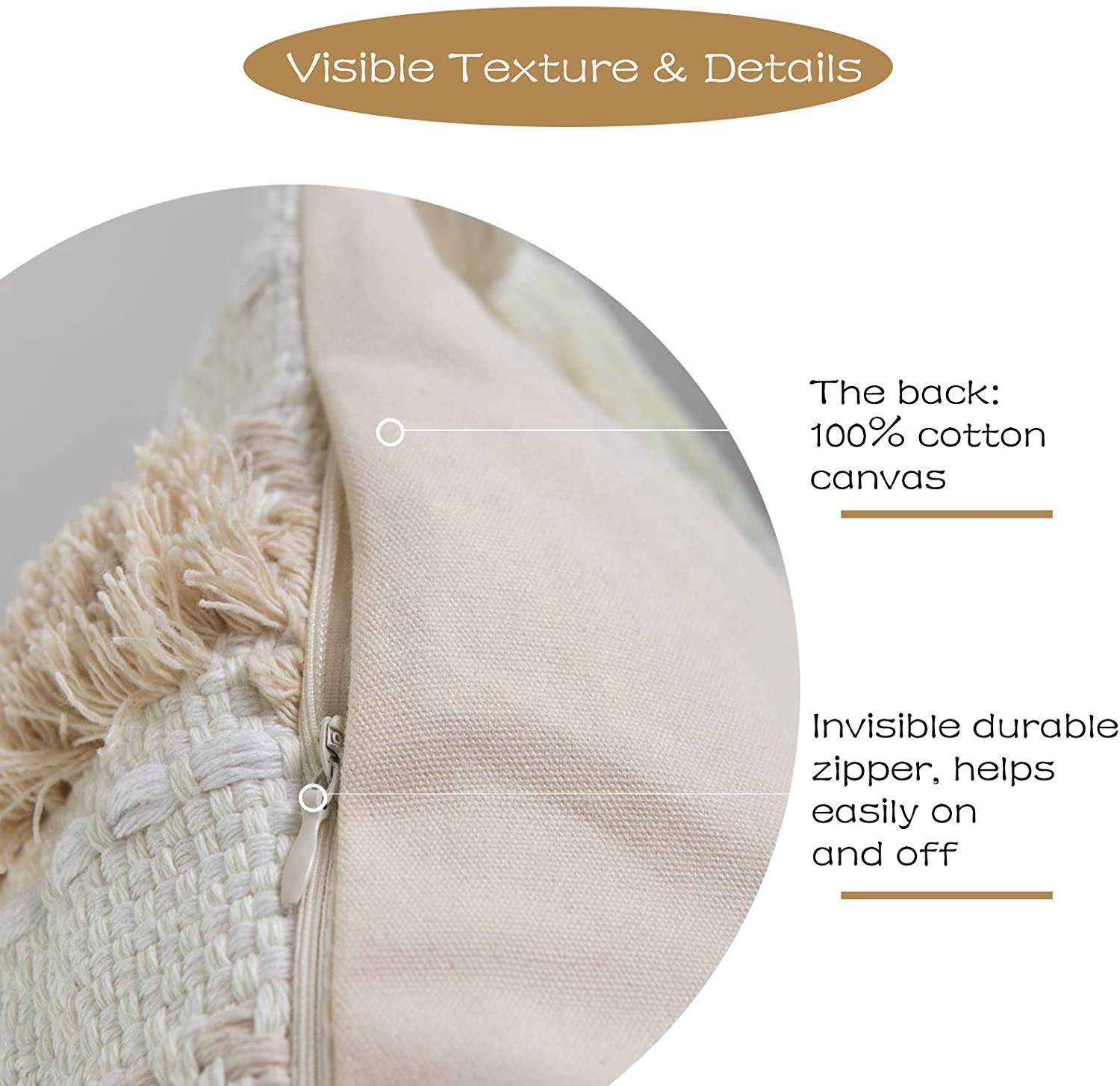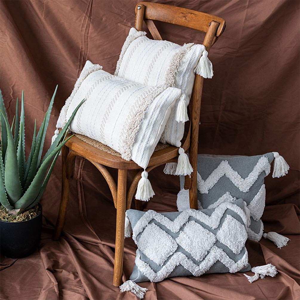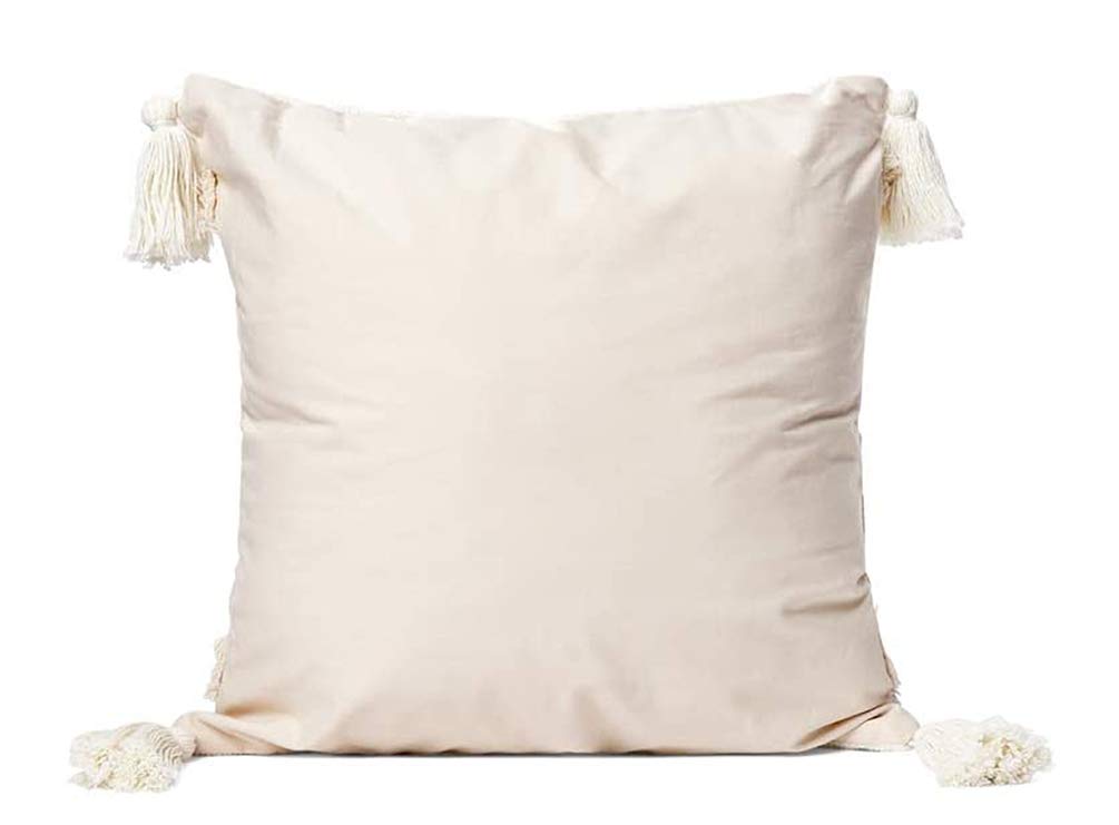 - HANDMADE TUFTED THROW PILLOW – Add a cozy accent to your couch with this Tufted Woven Tassel Throw Pillow. Features a handcrafted tufted and woven design that adds a boho touch to your sitting area, finished with the tassels on the corner lend a playful vibe. A neutral hue for easy stylish and looks great mixed with contrasting colors, use it over your favorite armchair in the living room, or throw it over the bed to create a comfortable look and feel. Design intended for the top side only.