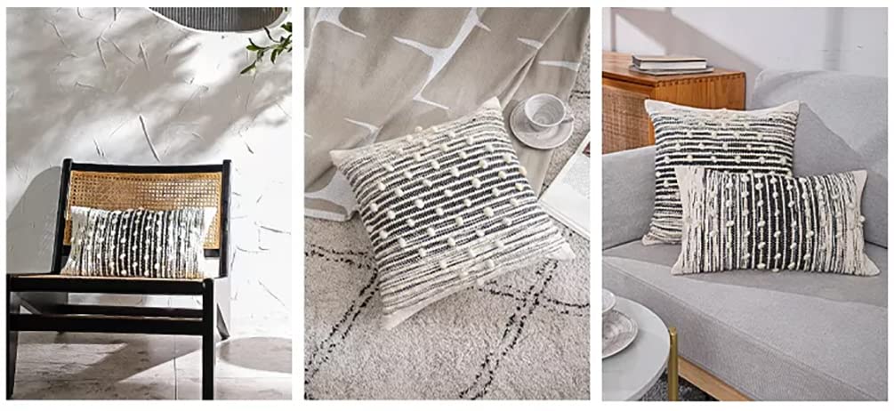 - HANDWOVEN COTTON-WOOL THROW PILLOW – Evoke a feeling of warmth in your interiors with this Striped Pom Pom Throw Pillow! Features bold, beautiful handwoven construction with a black and white striped pattern to bring timeless appeal to your space, and it's adorned with pom pom accents for textural interest, making it a perfect home décor accessory for living room sofas or bedroom. Toss it on your sofa or armchair, or pair it with other throw pillows and blankets to create a cozy ambiance.