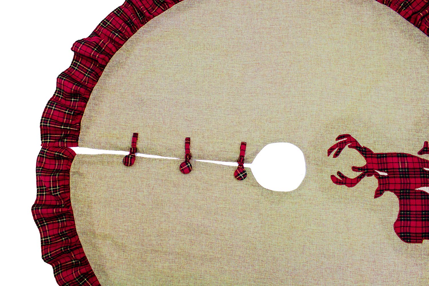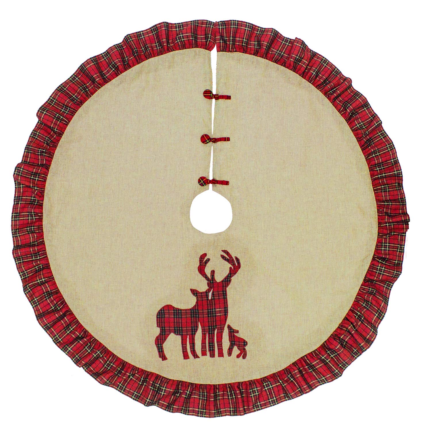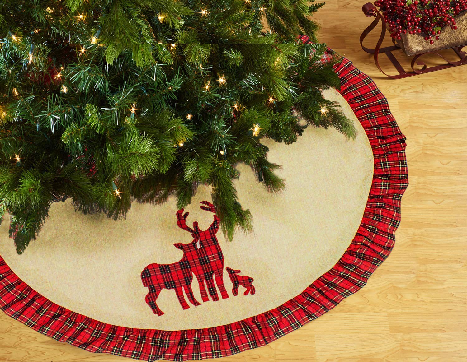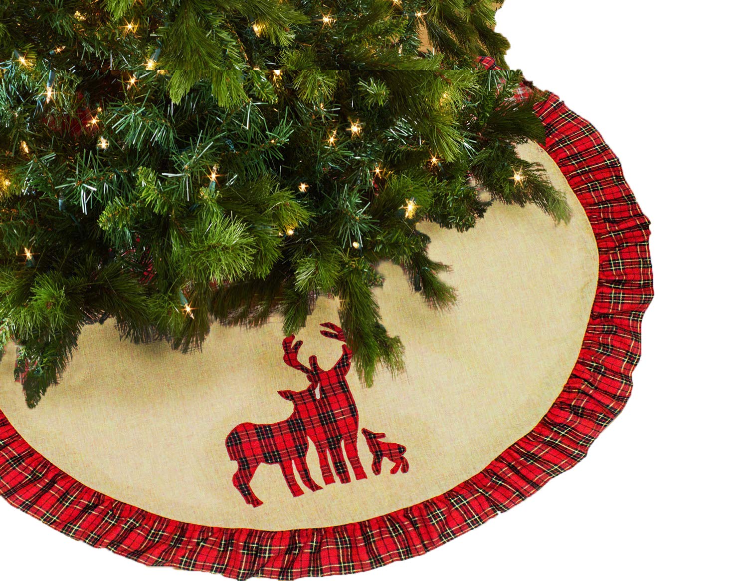 - Continue your trimmings underneath the tree with this festive Plaid Ruffle Reindeer Christmas Tree Skirt.