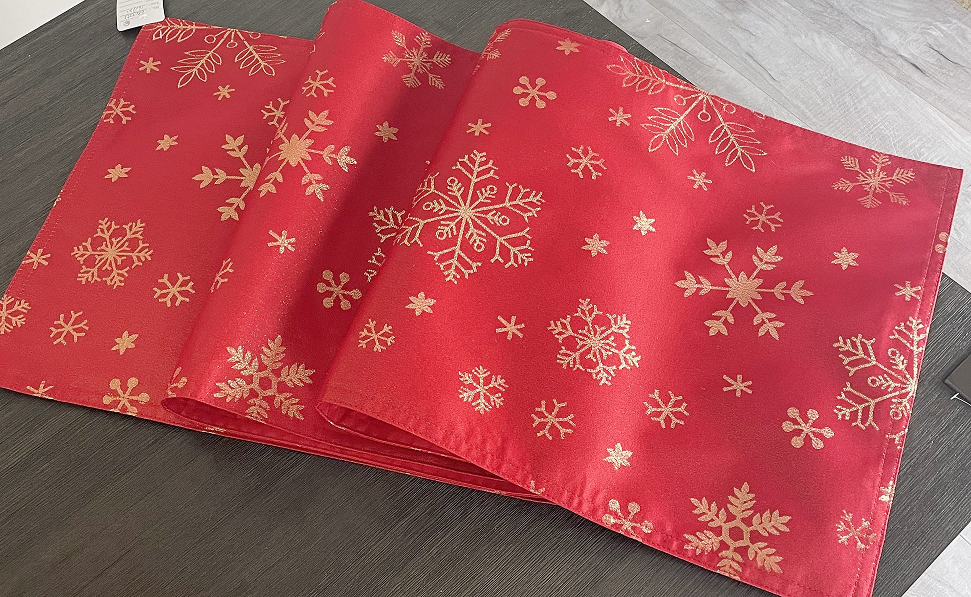 - FOIL PRINT SNOWFLAKE PLACEMATS, SET OF 4 – Festive and elegant at the same time, these Foil Print Snowflake Placemats are perfect to dress up your holiday tablescapes for special occasions and celebrations. It features an all-over foil snowflake pattern over a vivid red background for a glinting look that will brighten up any table. With a metallic glowing accent, this snowflake placemat will add grace and finesse to your holiday tabletop, pair with light tone flatware for a complete wow effect.