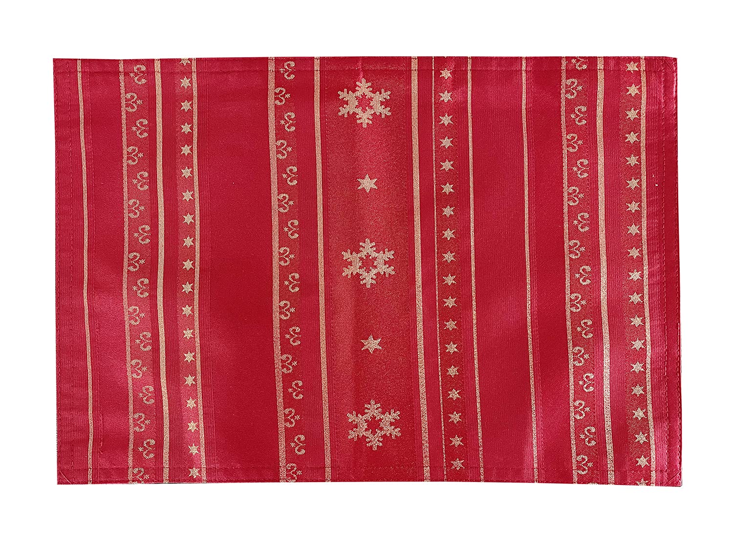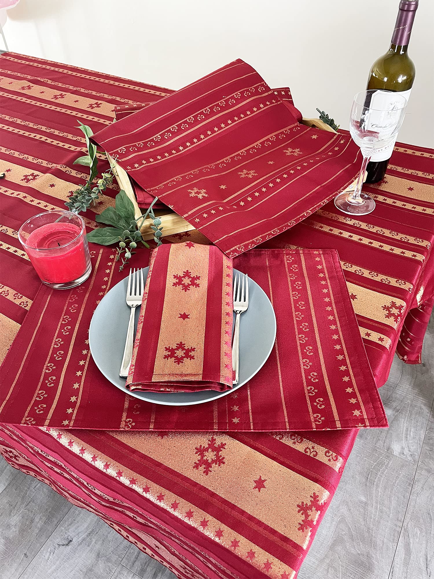 - SNOWFLAKE RED PLACEMATS, SET OF 4 – Creates a warm and festive setting for your holiday meals and celebrations with the Snowflake Printed Table Runner. It showcases the metallic printed snowflakes and stars on a red background makes a unique statement while the gold offers a subtle shimmer, creating an elegant, captivating look that will add festivity and beauty to any gathering. For entertaining, mix with gold flatware for an elevated look.