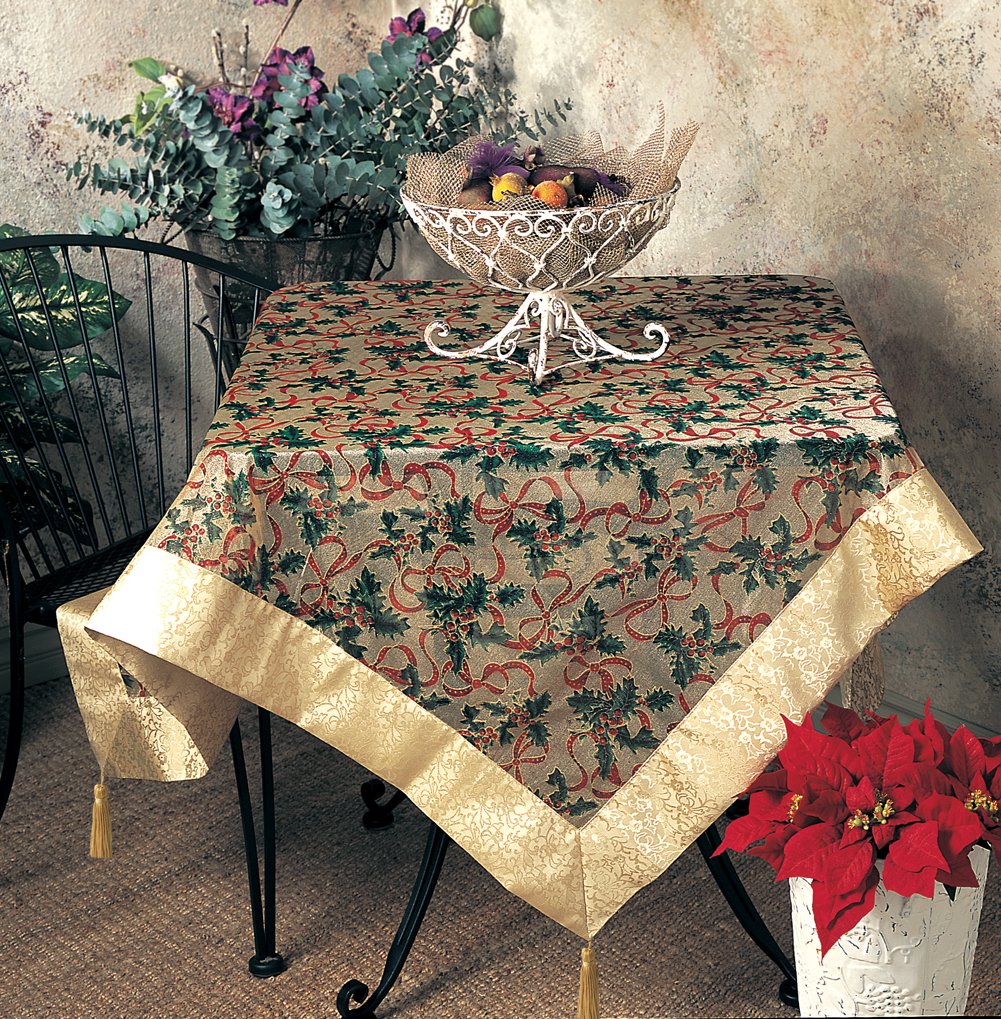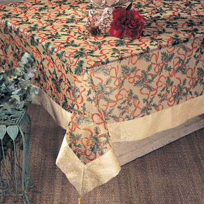 Fennco Styles Holly Ribbon Holiday Christmas Sheer Tablecloth - Gold Satin Border and Tassels Table Cover for Family Dinner, Banquets, Special Events and Home Decor