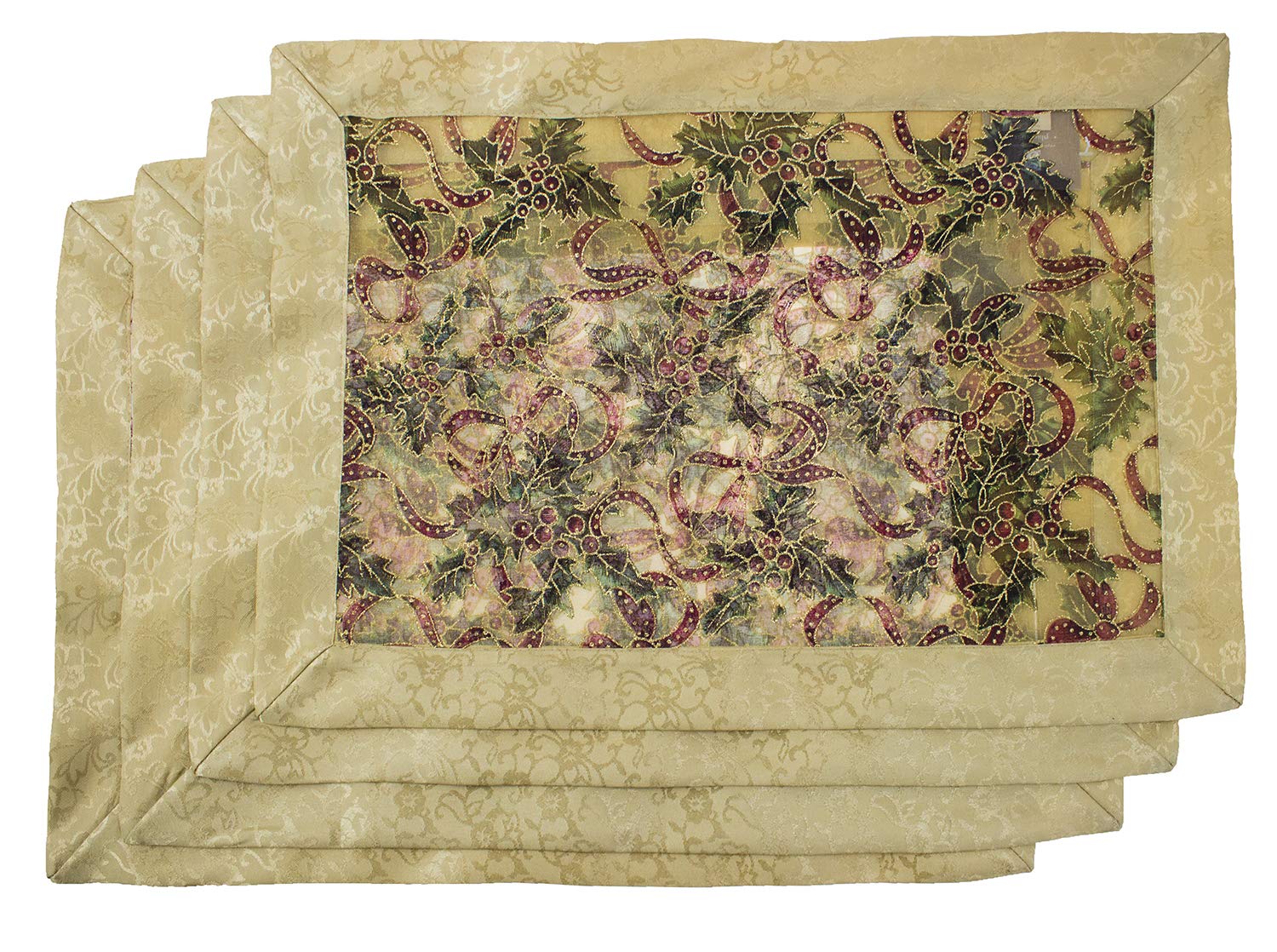 - HOLLY RIBBON PLACE MATS - Featuring green and red holly ribbon on polyester and gold satin border, these oblong placemats are the perfect choic for tasteful kitchen linens for your everyday use indoor and outdoor decoration. Christmas accent pattern is sure to add a fun festive touch to your table.
