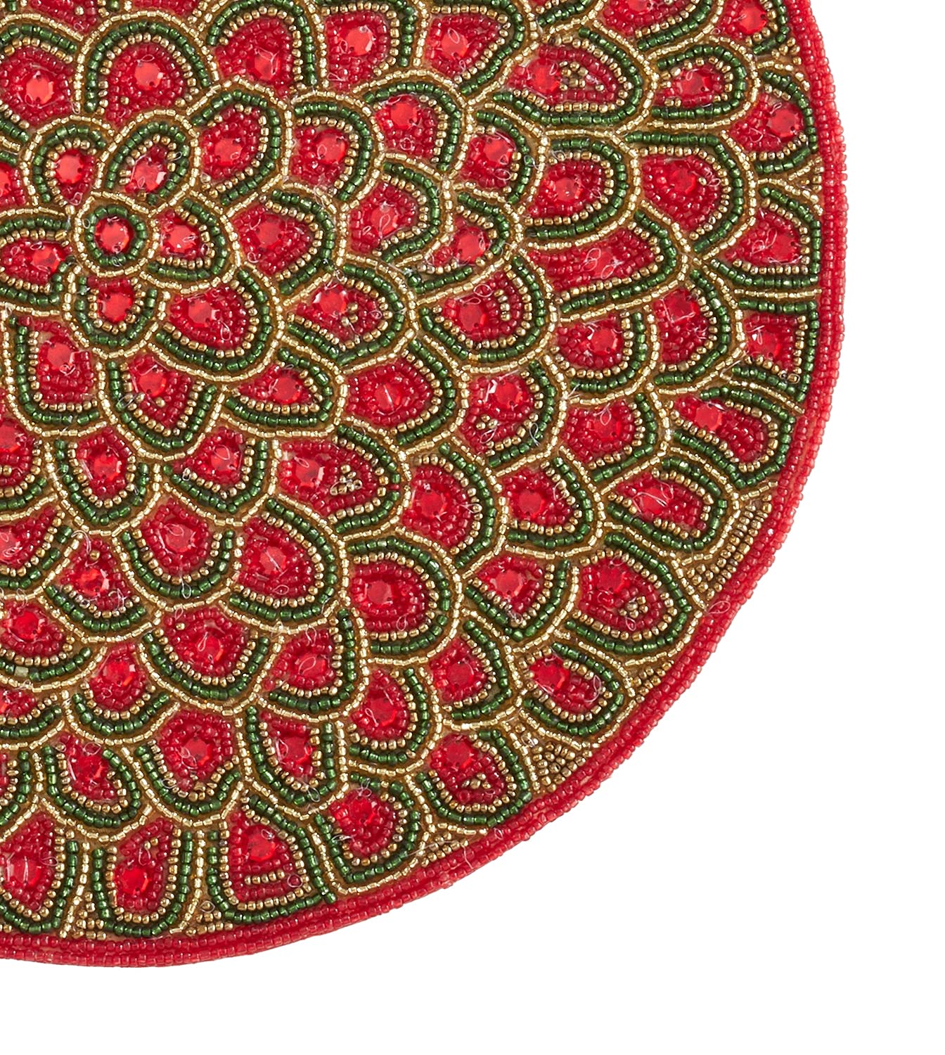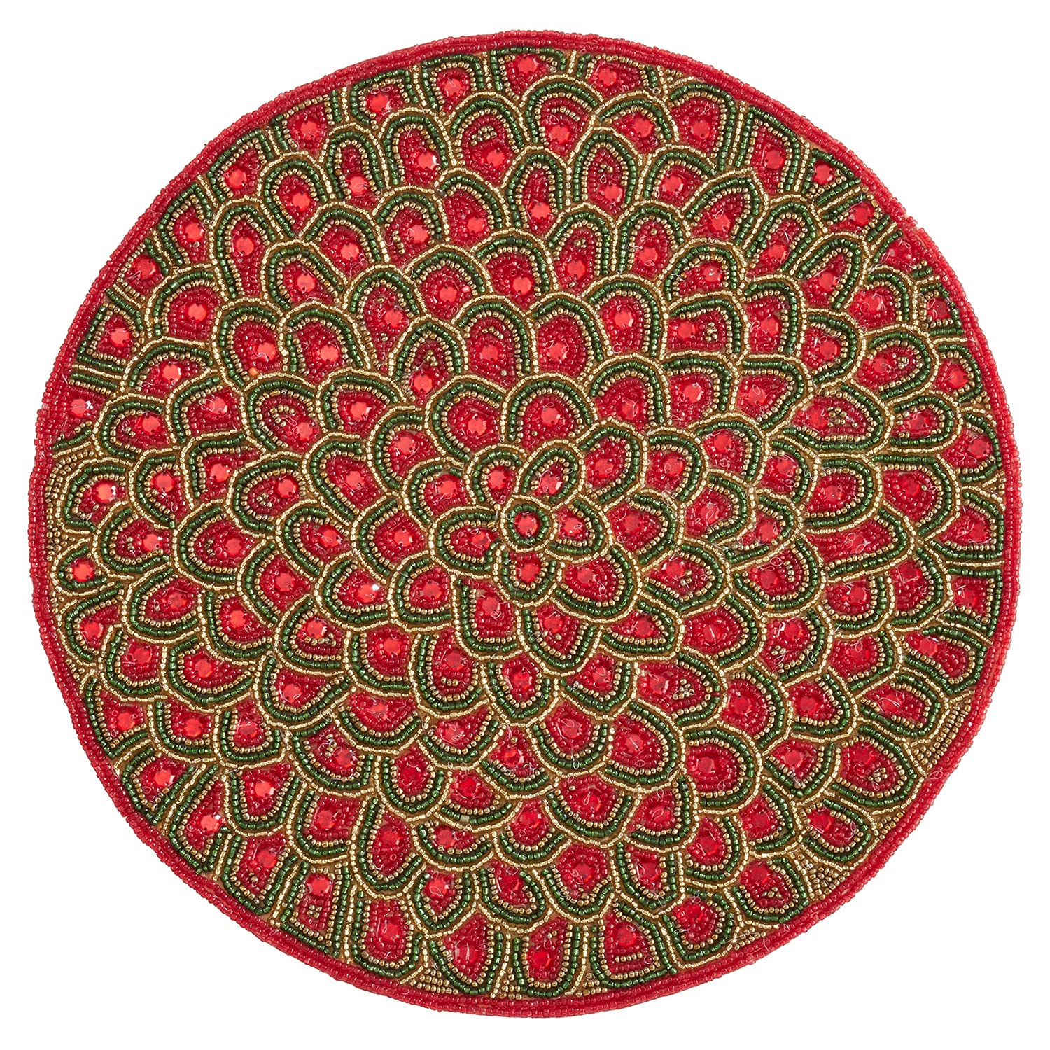 - GLASS BEADED PLACE MAT – Featuring red, green and gold plastic and glass beads, this round placemat is the perfect choice for tasteful decoration of your dining set or table top. This geometric placemat is great for holiday parties, family gatherings, weddings, showers, and more.