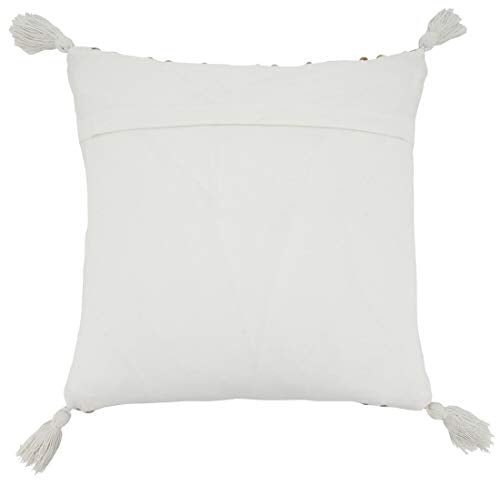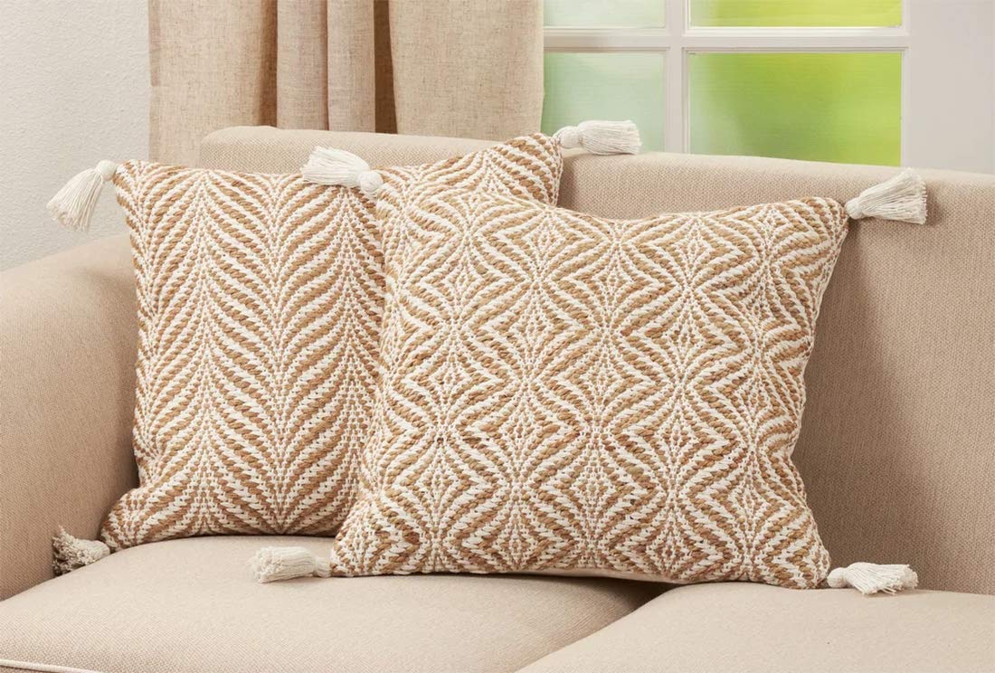 Details: Fennco Styles Jute Cotton Woven Decorative Throw Pillow with Tassel Curate your living space with the functional and aesthetic appeal of the Jute Cotton Woven Pillow. This square pillow features a woven chevron pattern in hues of white and natural, and tasseled corners for added depth and dimension. This square throw pillow helps create a comfortable sitting experience whether you toss it on an armchair, bed or couch. PRODUCT DETAILS : Dimensions: 20 x 20 inches Material: jute, cotton Care Instructions: spot clean Our Philosophy: At Fennco Styles you can shop a carefully selected range of home, lifestyle and gift products. We believe our homes should be reflections of the journeys we take. Our personal spaces deserve designs with a soul, a story, and a purpose. Our lifestyle brand offers inspired living through high-quality products, exclusive designs, and timeless style. We aim to source ethically, looking for products that are made from sustainable materials and designed to last and seeking out Makers that are conscious of their impact on the environment.
