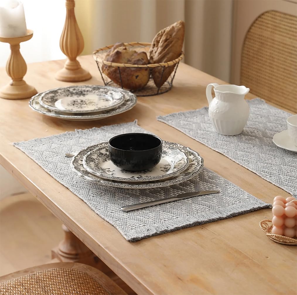 - PERFECT DINING TABLE MATS – At 12 inches in width and 19 inches in length, this rectangle table mat makes a practical table accessory for everyday use or entertaining. The geometric pattern lends a modern, timeless flair to your supper space, the fringes not only add a decorative element but also contribute to the overall texture and visual interest of the placemats. This diamond placemat protects your table against spills and creates a clean and organized dining space while adding a touch of elegance for your dinnerware and other decorative centerpieces.