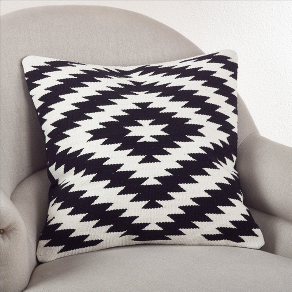 - BLACK & WHITE KILIM THROW PILLOW – Dress up your any room with these Kilim Design throw pillow. Features a black and white mesmerizing geometrical design on pure cotton that pairs well with modern monochrome decor. Filled with downy duck feather, this pillow makes a soft and comfortable addition to your home.