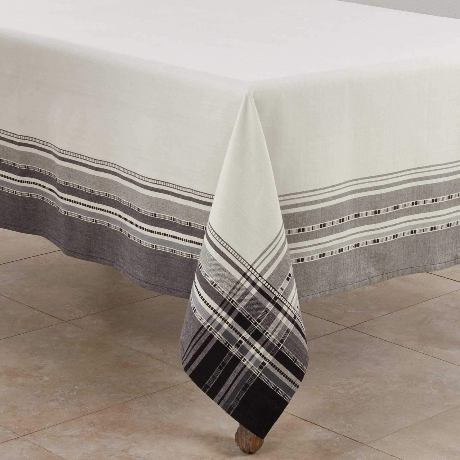Details: Fennco Styles Neutral Cotton Tablecloth with Plaid Border Design: Add some variety to your kitchen linens with this contemporary solid border tablecloth. Featuring grey stripes meet at each corner to form a classic plaid brings a luxuriously soft touch, the contrast of the solid color backdrop acts as a pretty accent that delivers a chic pop of color to your table. The border tablecloth is ideal for holiday decorations, banquet, family gathering, outdoor picnic, special events and more. Also able to make an upscale touch of texture, hammered silverware, cottage ceramic products and offers great contrast against light or dark wooden tables and place settings. PRODUCT DETAILS : Dimensions: 65 x 104 inches Material: cotton Care Instructions: cold machine wash, gentle cycle; no bleach, tumble dry or heat Our Philosophy: At Fennco Styles you can shop a carefully selected range of home, lifestyle and gift products. We believe our homes should be reflections of the journeys we take. Our personal spaces deserve designs with a soul, a story, and a purpose. Our lifestyle brand offers inspired living through high-quality products, exclusive designs, and timeless style. We aim to source ethically, looking for products that are made from sustainable materials and designed to last and seeking out Makers that are conscious of their impact on the environment. Click Add To Cart to order your White sheer tablecloth and curate a contemporary and personalized aesthetic in your home, today!