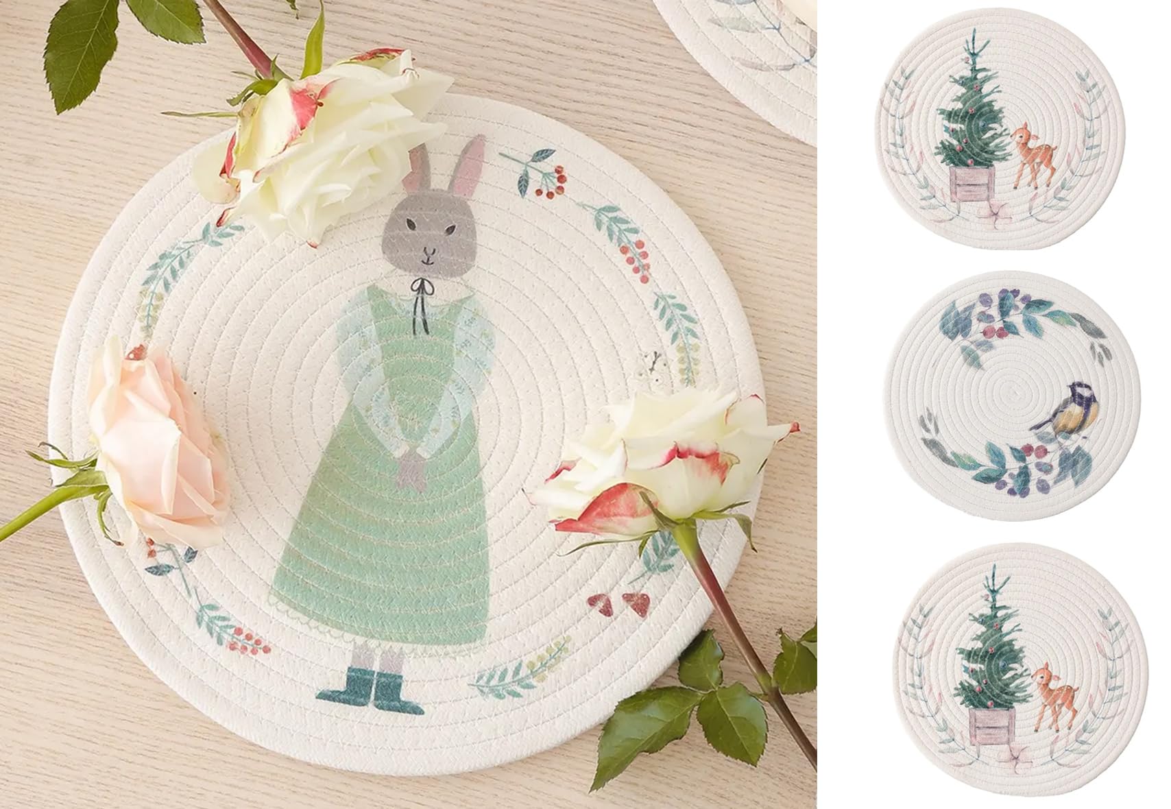 Fennco Styles Rabbit & Botanical Print Cotton Blend Woven Placemats 12" Round, Set of 4 - Cartoon Animal Design White Table Mats for Home Décor, Dining Table, Banquet, Holiday and Family Gathering