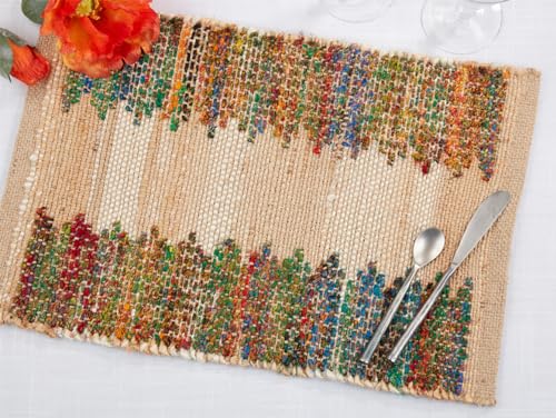 - PREMIUM QUALITY - Our dining placemat prioritizes sustainability by using recycled cotton and jute materials. Not only does this add to the rustic and natural charm, it also helps reduce environmental impact. This rainbow banded placemat provides an elegant backdrop for your tableware and enhances the overall dining experience. Ideal for everyday use, casual events, holidays, and special occasions.Care: Spot clean.