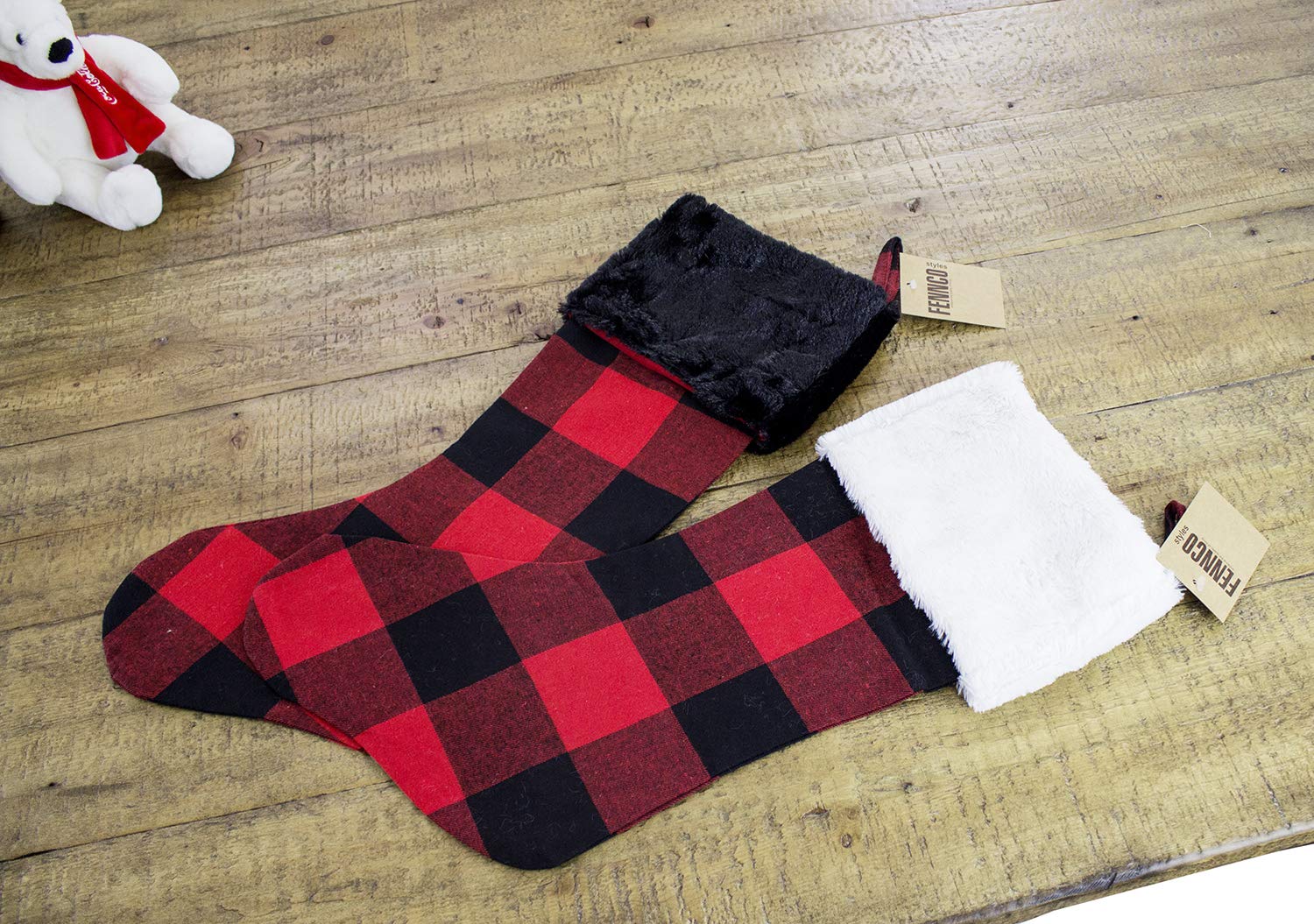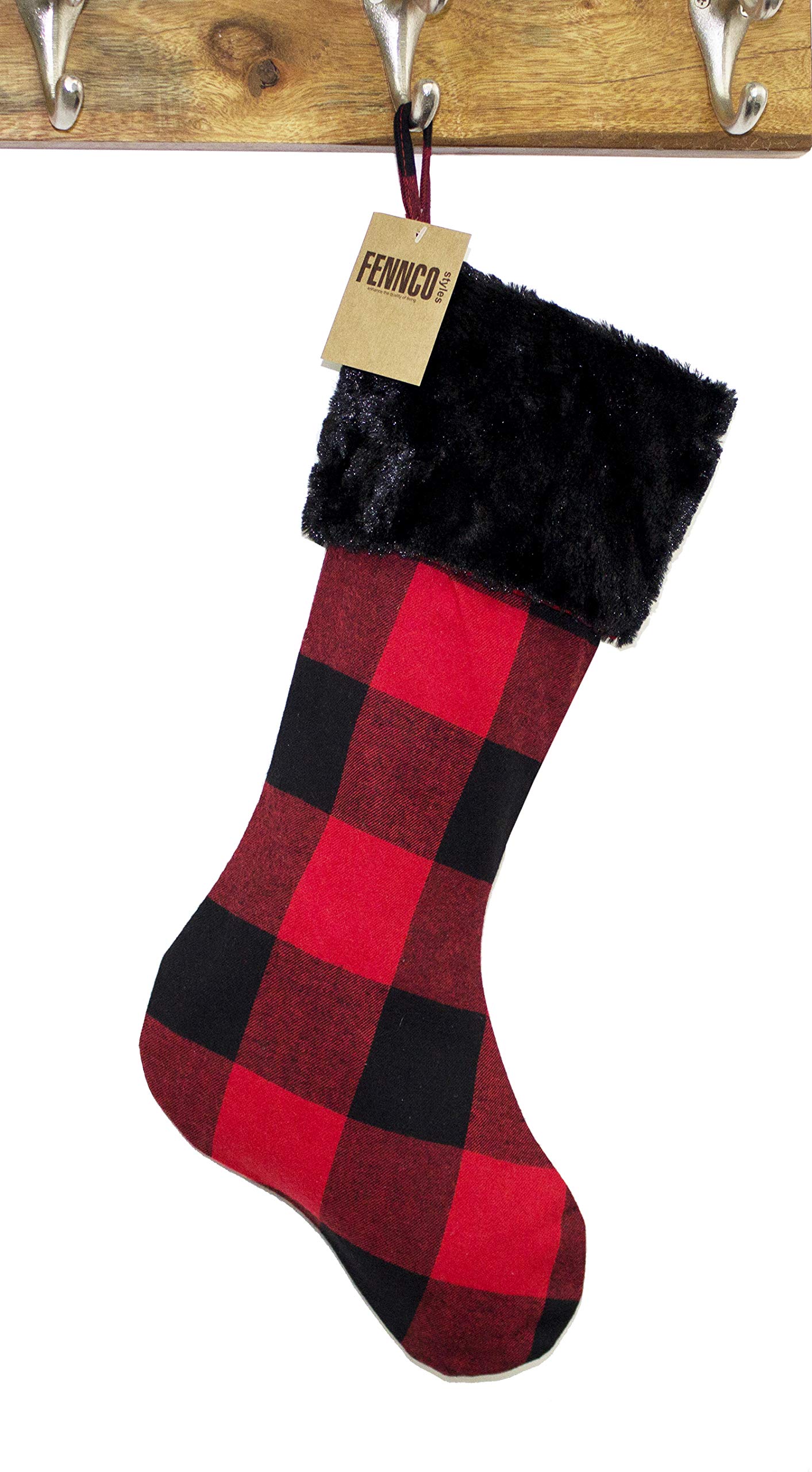 Fennco Styles Red and Black Buffalo Plaid with Black Faux Fur Design Christmas Stocking 13" W x 19" L - Festive Hanging Stocking for Home, Christmas Tree, Fireplace, Office and School Décor