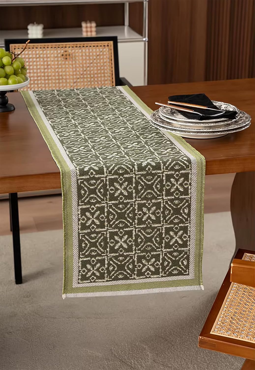 Elevate your table setting with this beautifully Reversible Jacquard Vintage Table Runner. Thoughtfully designed for both function and style, this runner features a reversible dual-tone pattern that lets you switch between two sophisticated looks, rich green on one side and soft beige on the other. The intricate geometric motif is woven in, not printed, for a high-quality, artisan appearance. It's a highly versatile runner that's easy to pair with a wide range of dinnerware with the rest of your table linens for a creative and chic look.
