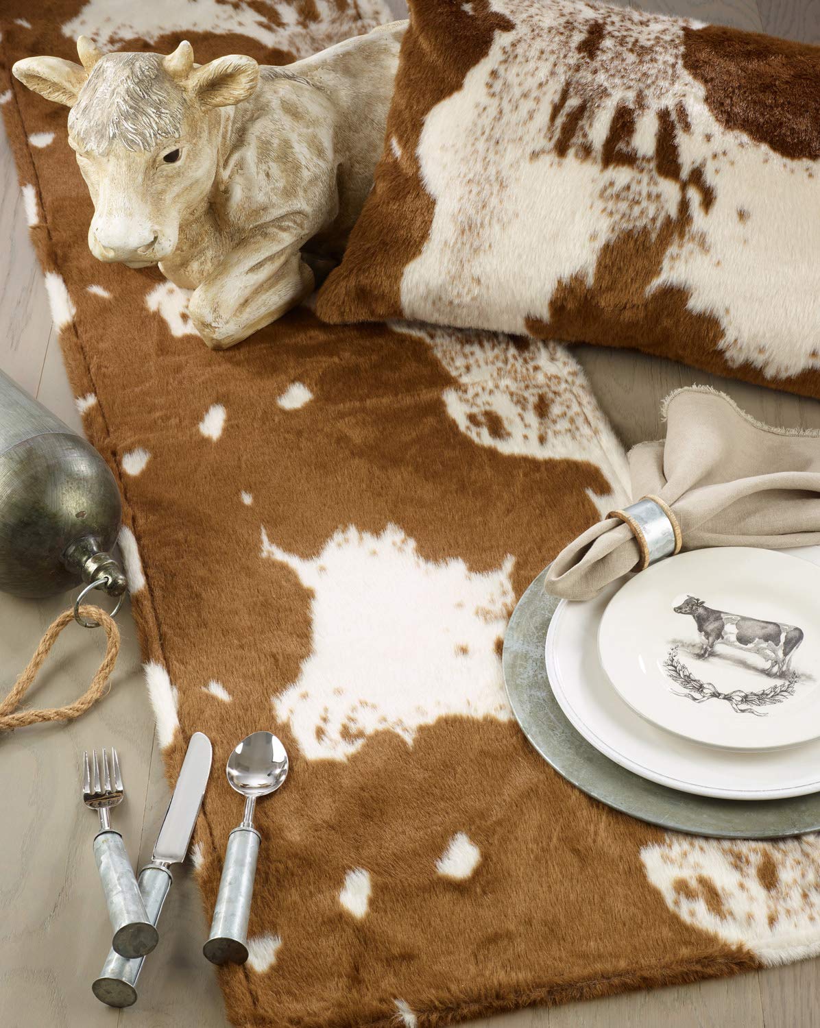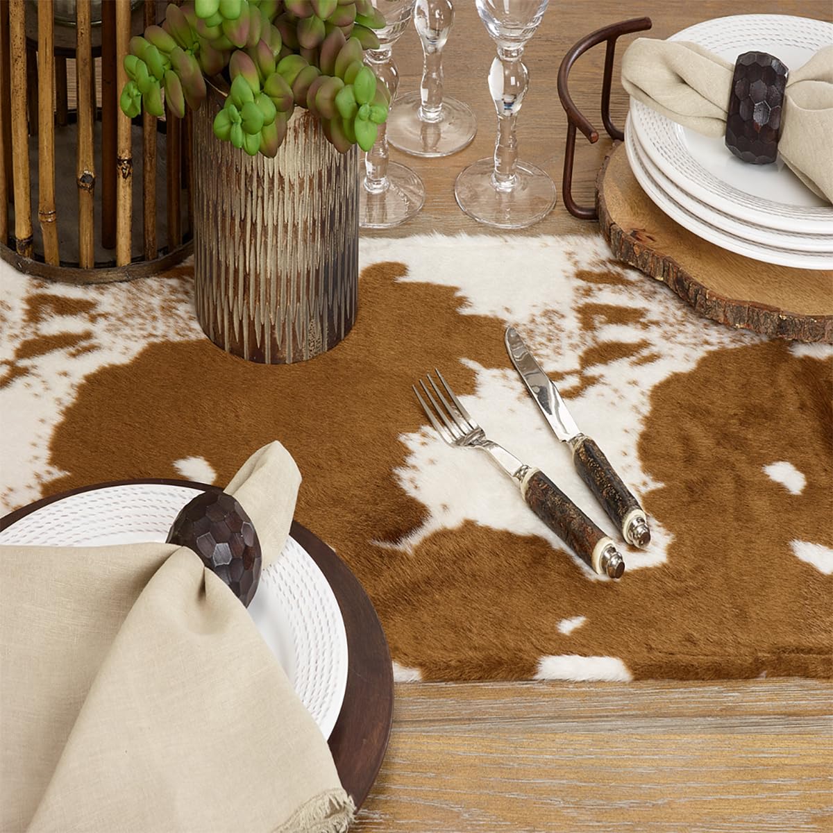 - FAUX FUR COWHIDE TABLE RUNNER – Brighten your tabletop with this fuzzy and functional fur table runner from Fennco Styles. Whether it's an upscale dinner party or a festive family feast, this hide table runner adds a twist of old Western style to your dining table. The soft faux fur design is the perfect conversation piece by adding eye-catching texture and visual interest. Make a stylish statement with the sumptuous softness of plush faux fur in the cold weather.