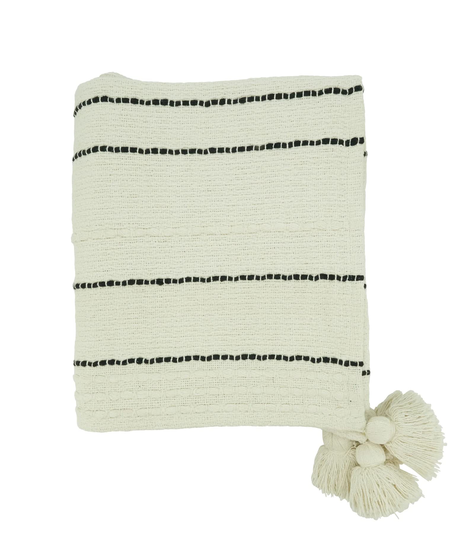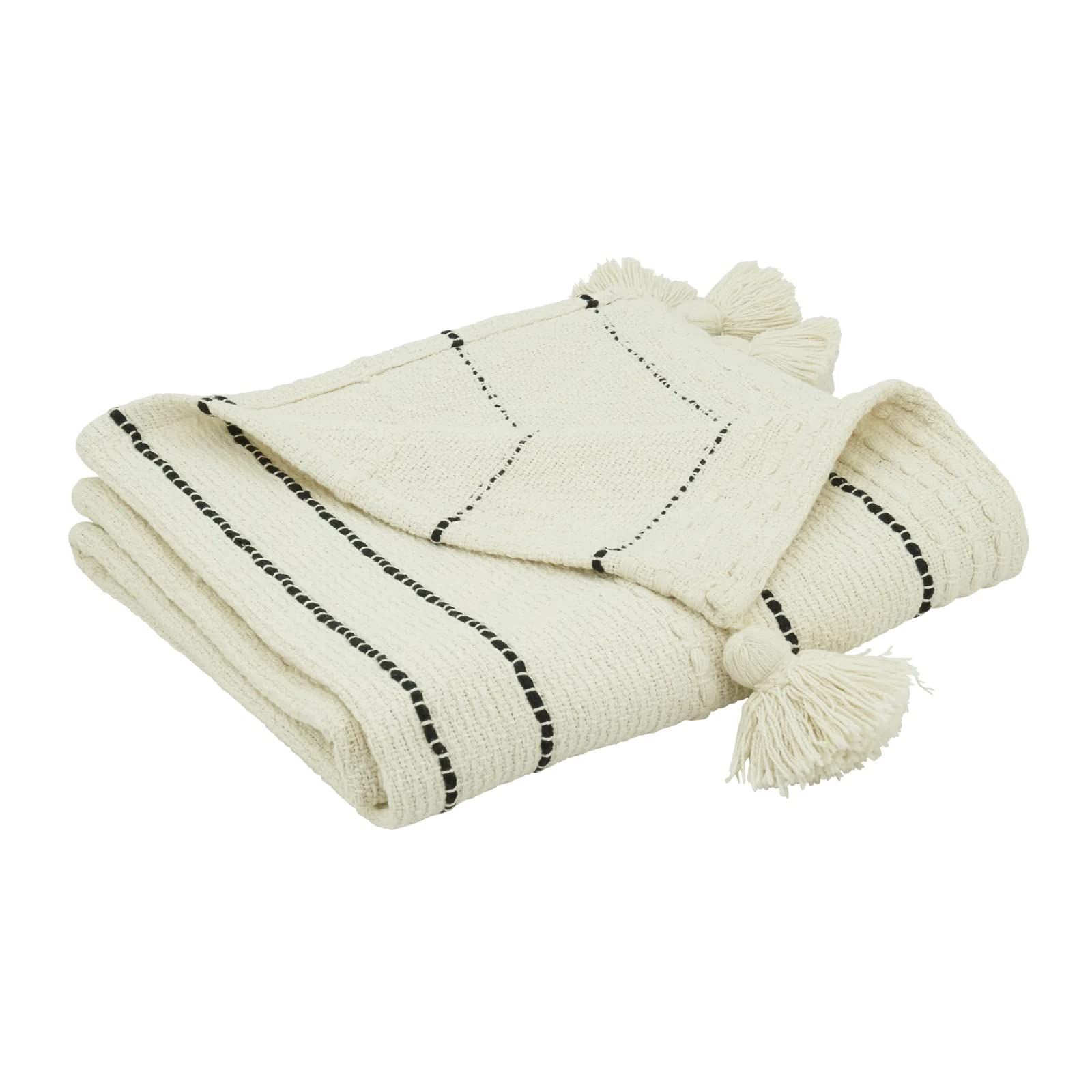 Fennco Styles Stripe Cotton Throw Blanket with Chunky Tassel 50" W x 60" L - Ivory Woven Blanket for Couch, Bedroom, Living Room and Office Décor