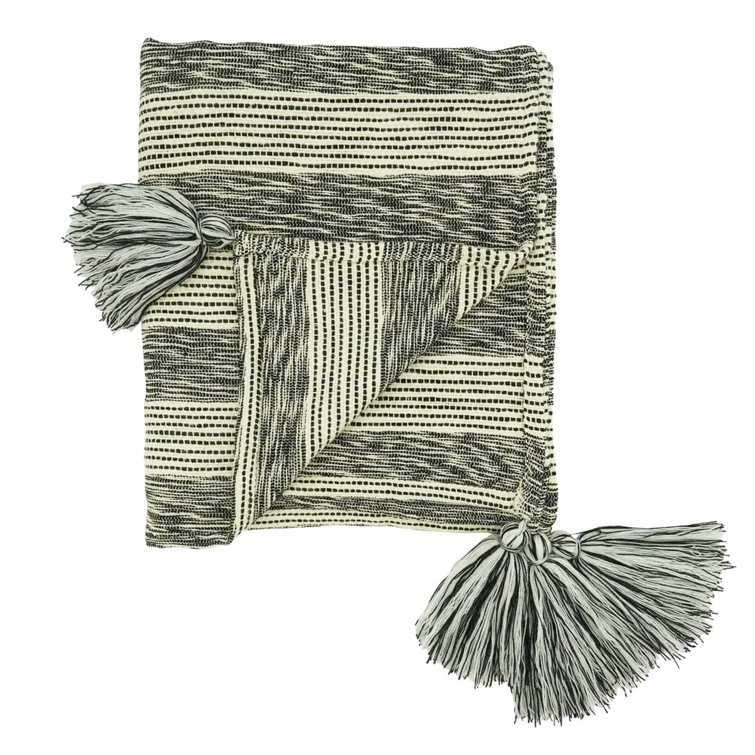 - STRIPED TASSEL COTTON THROW BLANKET – Add texture and contrast to your living room décor with this Striped Tassel Throw Blanket. Designed with a classic color combo of black and white, the subtle striped pattern lends visual appeal and charm to any room. A lavish tassel accent on the edges for fun flair you'll love adding to your resting spot. This neutral striped throw blanket coordinates well with a variety of décor styles and pairs well with any color scheme or décor style in your home.