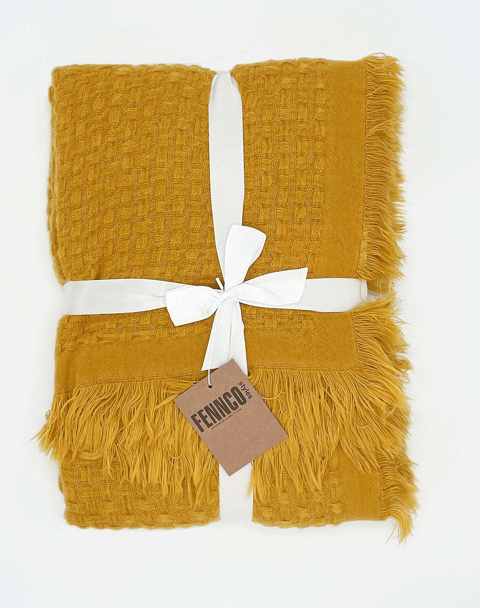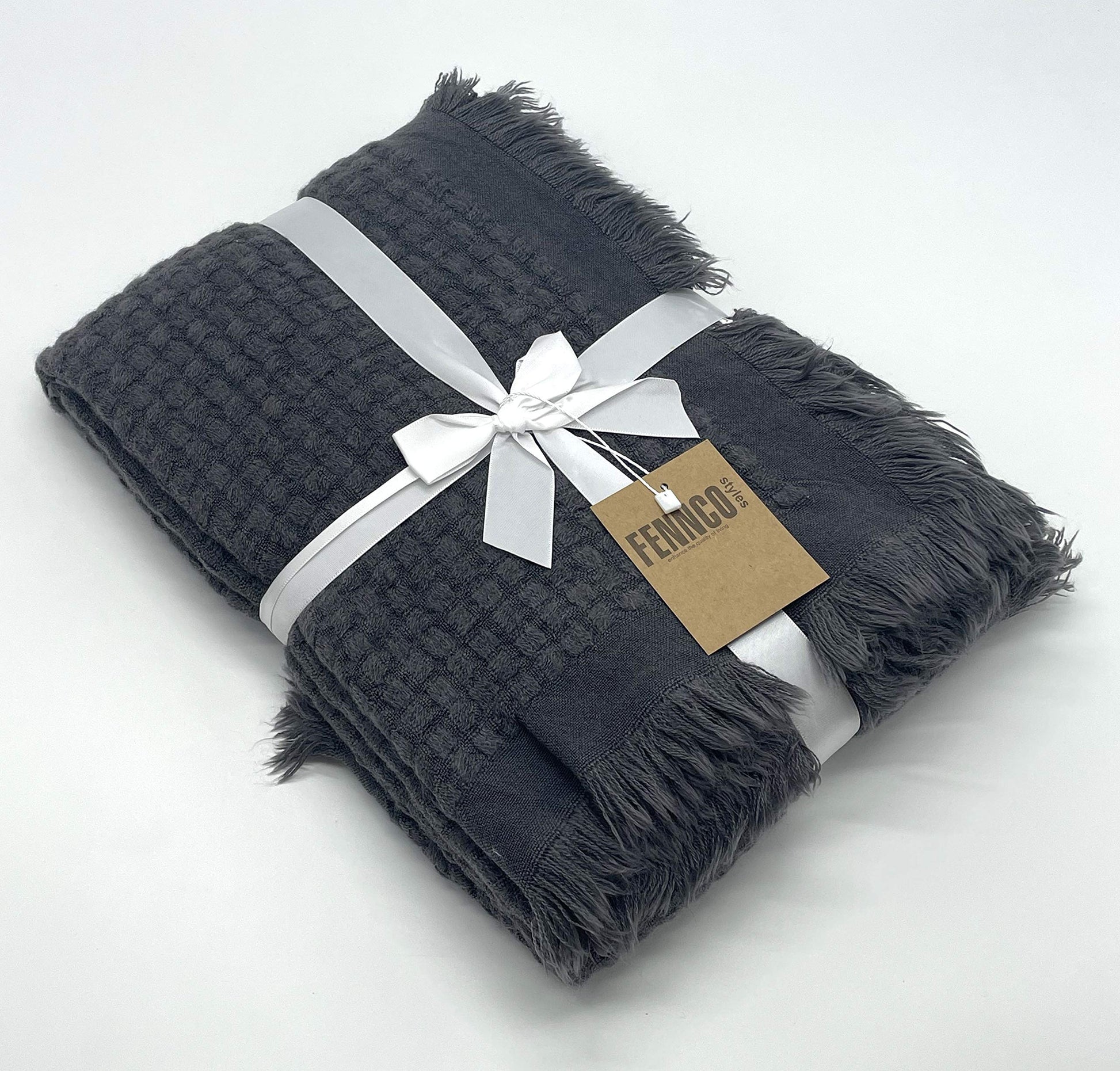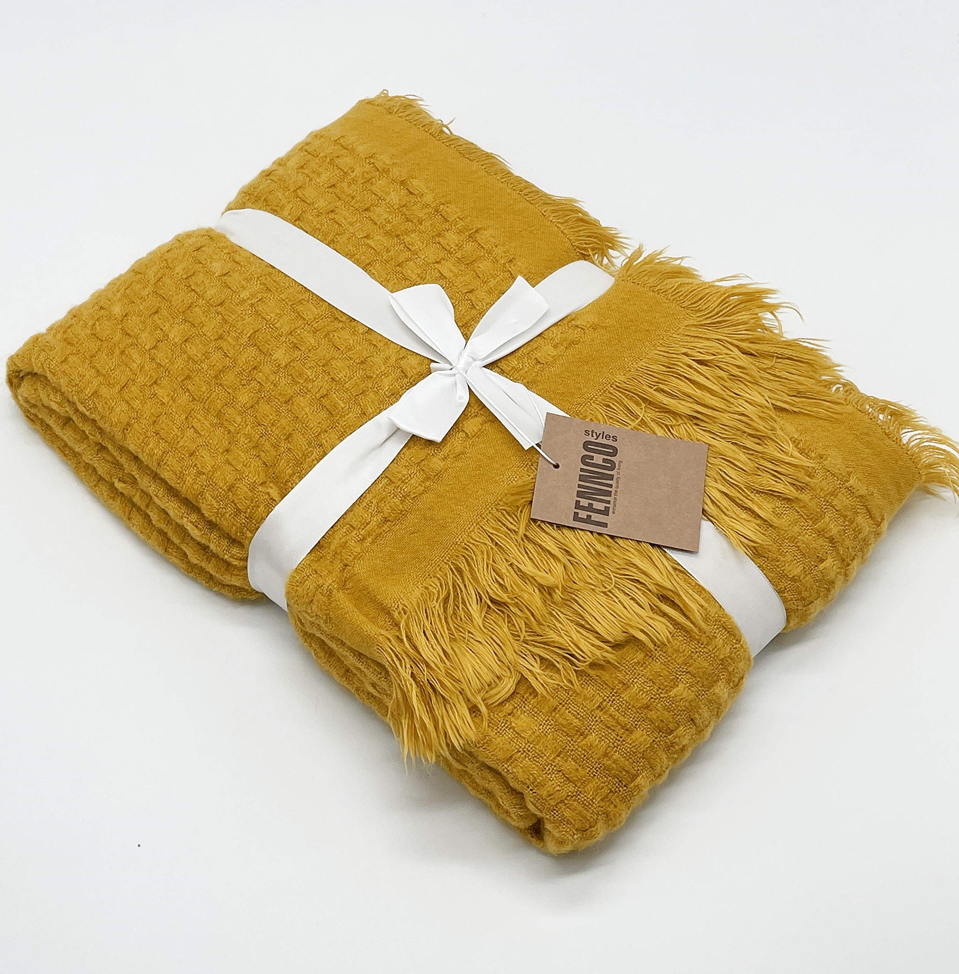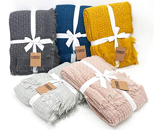 Details: Fennco Styles Waffle Weave Solid Lightweight Throw Blanket with Fringe Add a beautiful pop of color to your home with this Textured Fringe Throw Blanket. Features subtly weave textured that's adds sophisticated and soft to the touch to this throw blanket, finished with fringe detail on the ends for ornate appeal. Make it particularly beautiful when draped over the edge of an armchair. Neutral color as well as to pair with a wide range of accent pillows. PRODUCT DETAILS : Dimensions: 50 x 60 inches Material: acrylic Care Instructions: cool machine wash, delicate cycle. do not bleach, tumble dry low. medium iron. Our Philosophy: At Fennco Styles you can shop a carefully selected range of home, lifestyle and gift products. We believe our homes should be reflections of the journeys we take. Our personal spaces deserve designs with a soul, a story, and a purpose. Our lifestyle brand offers inspired living through high-quality products, exclusive designs, and timeless style. We aim to source ethically, looking for products that are made from sustainable materials and designed to last and seeking out Makers that are conscious of their impact on the environment.