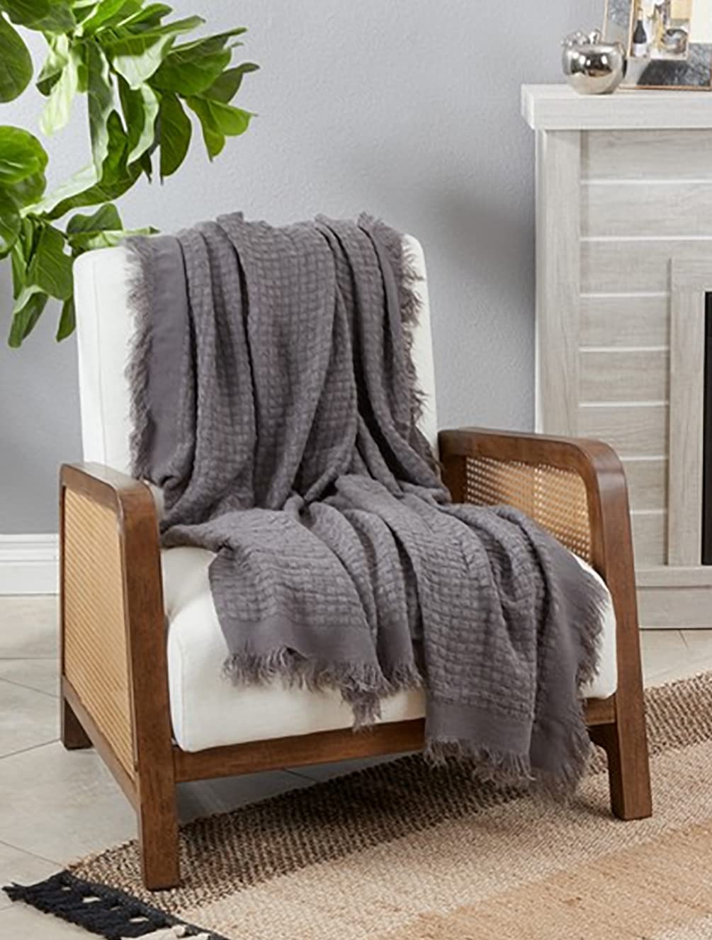 - WAFFLE WEAVE FRINGE THROW BLANKET – Add some coziness to your minimalist decor with this Waffle Weave Fringe Throw Blanket. Featuring a waffle-weave design in a solid hue for textural flair and accented with fringes along the edges, it's sure to bring an eye-catching style to your bedroom aesthetic. This stylish throw seamlessly blends with and helps accentuate your simply elegant decor style. Use it over your bed, sofa, or armchair in the living room to create a comfortable look and feel.